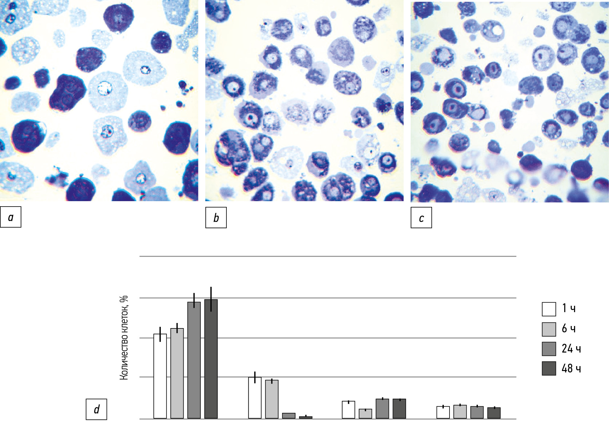 Рис. 1. Морфология и клеточный цикл изолированных гепатоцитов в динамике культивирования: a, b, c – гепатоциты в динамике культивирования через 1, 24 и 48 ч соответственно. Окраска толуидиновым синим. Увеличение ×400. d – распределения гепатоцитов по фазам клеточного цикла при их культивировании в стандартной питательной среде. G0/G1, S, G2/M – стадии клеточного цикла