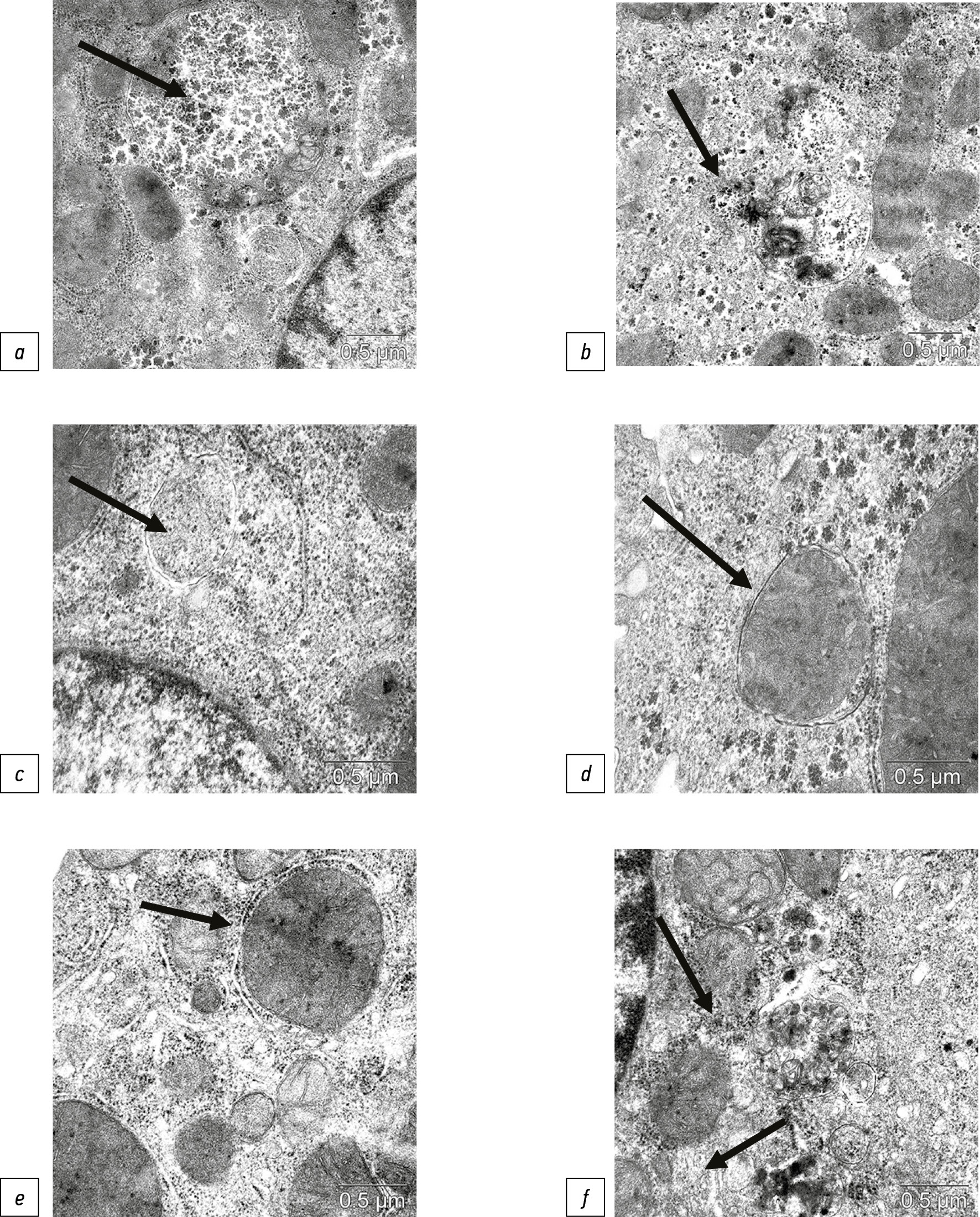 Если через 24 ч культивирования в составе аутофагосом наблюдали преимущественно гранулы гликогена, то при изучении ультраструктуры гепатоцитов через 48 ч культивирования были выявлены аутофагосомы с фрагментами цитоплазмы и митохондриями (рис. 2c, d). Митохондрии часто были окружены цистернами гранулярного эндоплазматического ретикулума (рис. 2e). Кроме того, наблюдали митохондрии с нарушением строения крист и повышенное количество аутолизосом с включениями мембранных структур, находящихся на разной стадии деградации (рис. 2f).