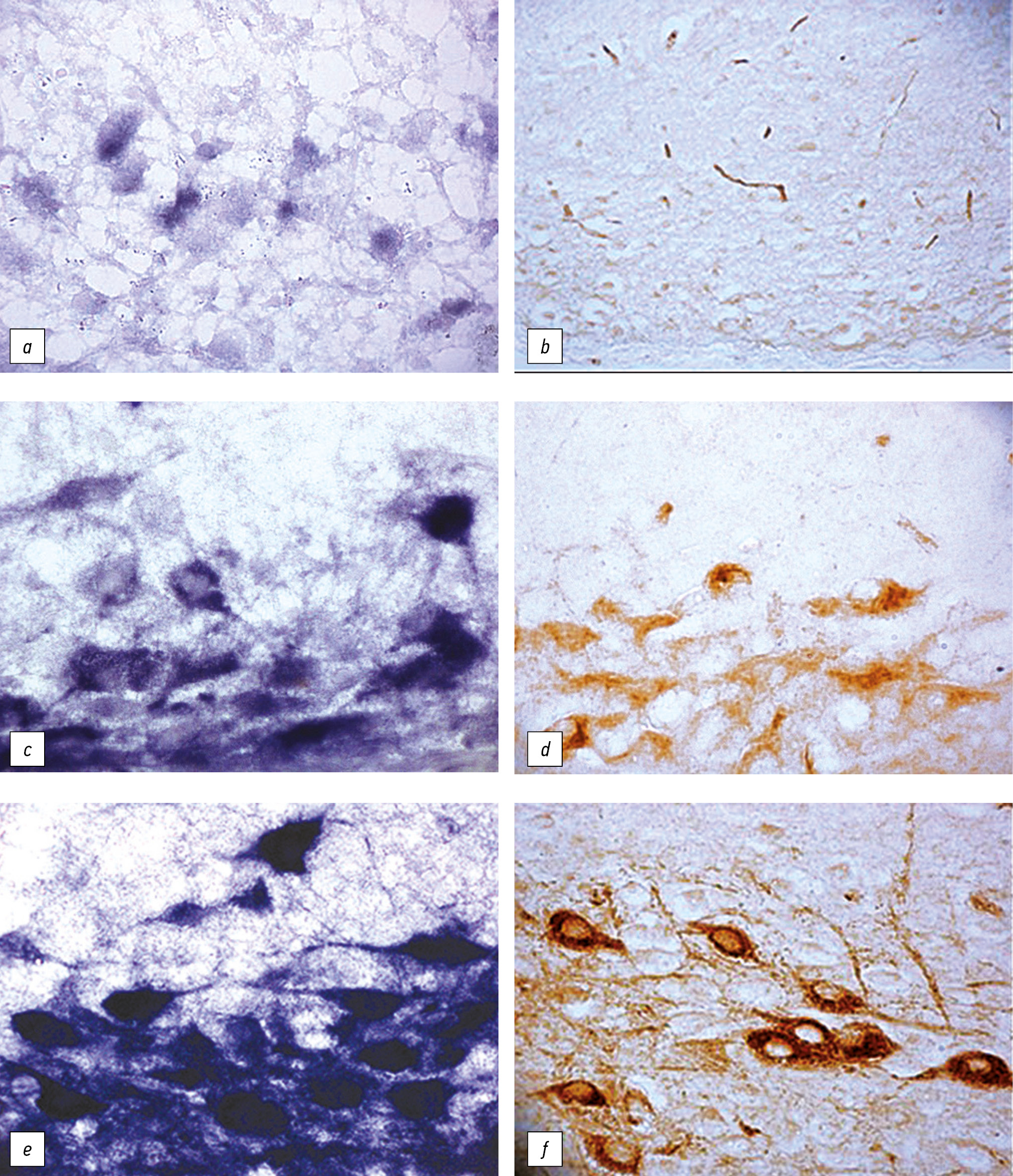 2. Fig. 1. MAO B in histaminergic neurons of the nucleus E2 of the rat hypothalamus in postnatal ontogenesis: (a, c, e – histochemical method for detecting MAO B activity (according to Zimatkin, Tsydik); b, d, f – immunohistochemical method for detecting protein MAO B (according to Zimatkin, Zaerko); a, b – day 10; c, d – day 20; e, f – day 90 of postnatal development. Digital micrograph. Magnification by 400)