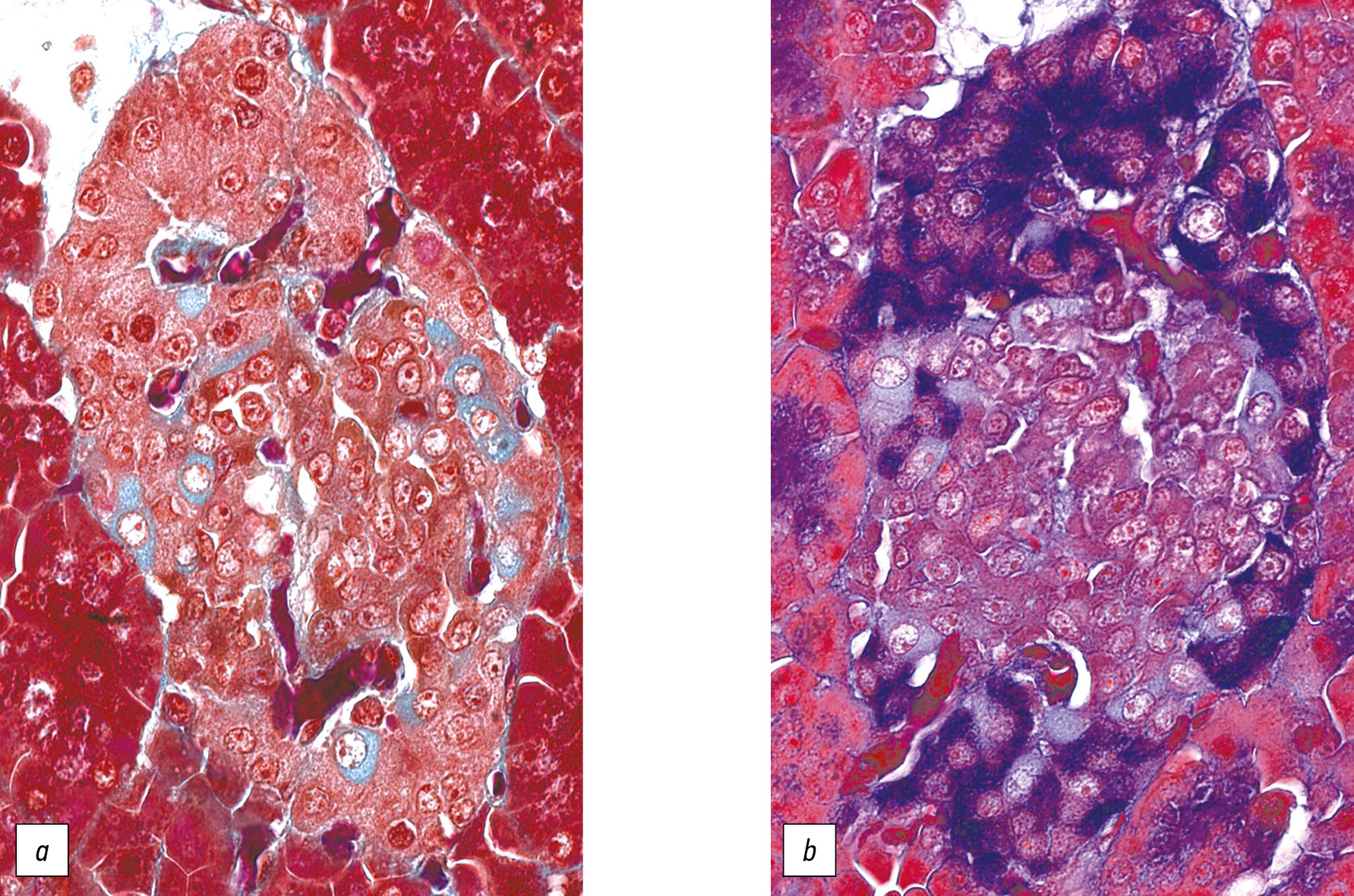 Рис. Островок поджелудочной железы голого землекопа (Heterocephalus glaber): a – окраска азаном (со световым зелёным в смеси Маллори), цитоплазма А-клеток – красно-коричневая, В-клеток – розовая, D-клеток – нежно-зелёная; b – окраска азаном в комбинации с паральдегид-фуксином по Гомори, цитоплазма А-клеток – тёмно-красная, В-клеток – тёмно-фиолетовая, D-клеток – серо-голубая. В обоих случаях ядра окрашены азокармином в красный цвет. Ок. ×10, об. ×100