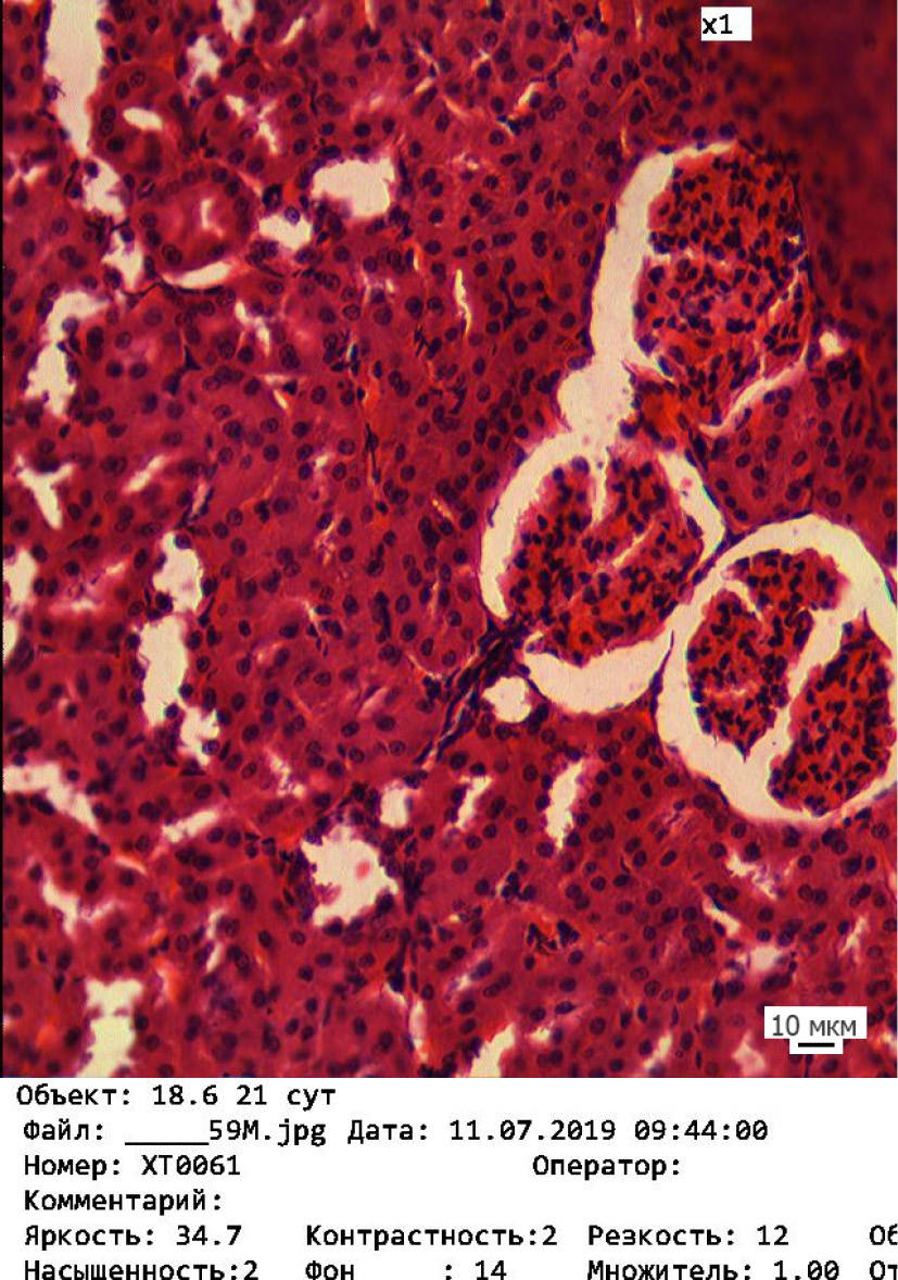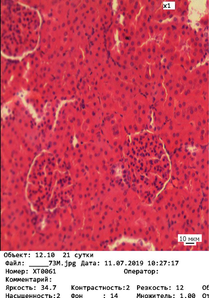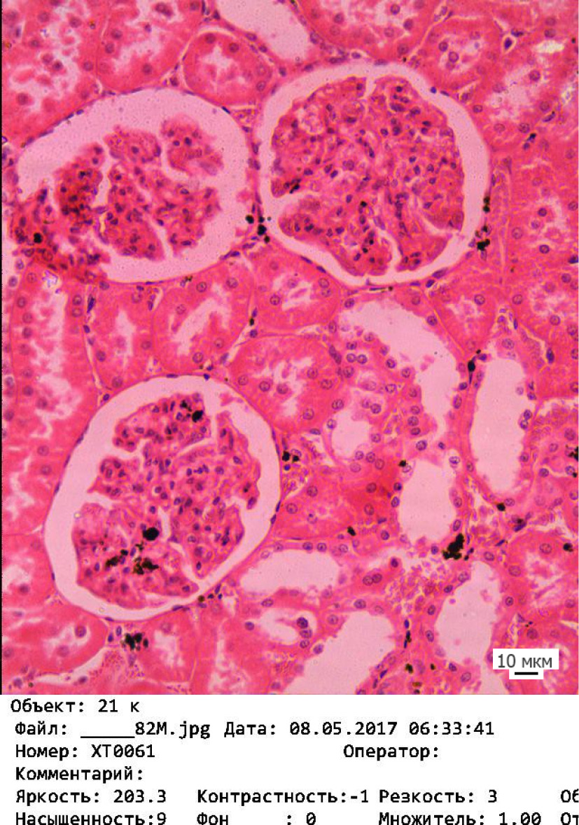 Морфологический и морфометрический анализ гистологических препаратов проводился с помощью медицинского микровизора проходящего света mVizo-103. Определяли размеры почечного тельца, просвет капсулы клубочка, площадь клубочковой капиллярной сети, также оценивали состояние канальцевого аппарата.