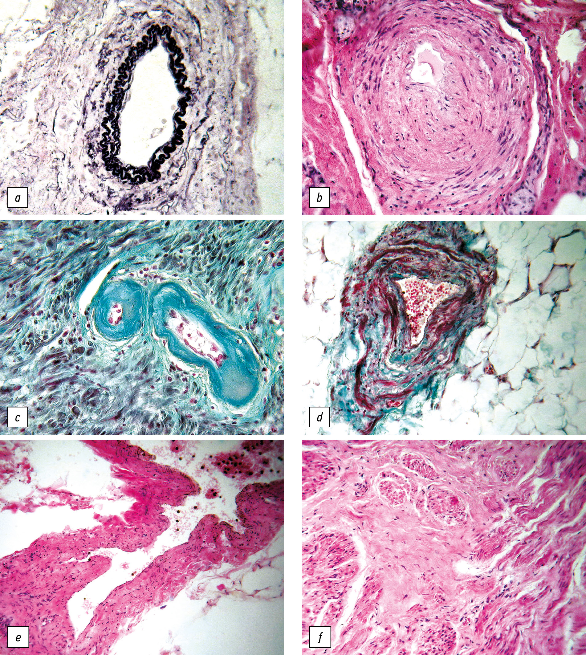 Рис. Морфологические изменения мочевого пузыря и его сосудистого русла у мужчин молодого возраста (d) и пожилого и старческого возраста (a, b, c, e, f): a — утолщение стенки средней артерии, повышенная складчатость и расщепление внутренней эластической мембраны на несколько пластинок; b — сужение просвета, резкое утолщение интимального слоя с разрастанием грубоволокнистой соединительной ткани и истончение гладкой мускулатуры средней оболочки крупной артерии; c — сужение просвета мелких артерий с замещением всех слоёв их стенок гиалином; d — стенка средней вены с хорошо заметными мощными пучками гладких миоцитов; e — стенка крупной вены с её замещением грубоволокнистой соединительной тканью с утратой гладких миоцитов; f — поля рубцовой соединительной ткани в мышечном слое мочевого пузыря; Фиксация нейтральным формалином. Окраска: a — фукселином по Харту; b, e, f — гематоксилин-эозином; c, d — по Масону с использованием бриллиантового зеленого. Увеличение: a, b, c, d — об. 20, ок. 10; e, f — об. 10, ок. 10.