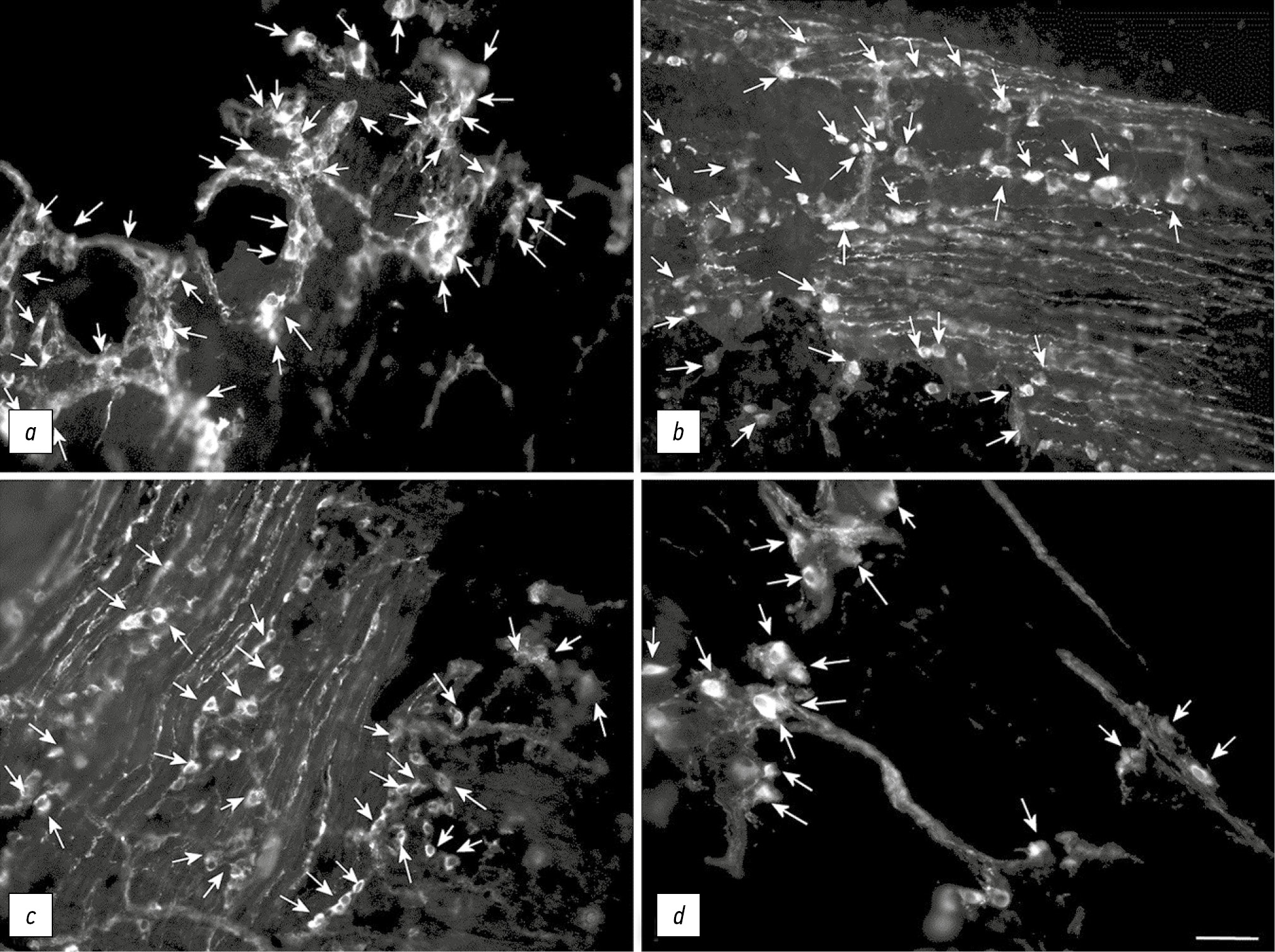 Рис. 1. Микрофотографии нейронов, содержащих нейрональную синтазу оксида азота, в интрамуральных узлах межмышечного сплетения толстой кишки крыс: а — новорождённых; b — 10-суточных; c — 20-суточных; d — двухлетних. Нейроны, иммунореактивные к нейрональной синтазе оксида азота, указаны стрелками. Флуоресценция Сy3. Об. — 20, ок. — 10, масштаб — 50 мкм. / Fig. 1. Micrographs of neurons containing neuronal nitric oxide synthase in the intramural ganglia of the intermuscular plexus of the large intestine of rats: а, newborns; b, rats aged 10 days; c, rats aged 20 days; d, 2-year-old rats. Neurons immunoreactive to neuronal nitric oxide synthase are indicated by arrows. Cy3 fluorescence. Lens, 20; eye glass, 10; scale, 50 µm.