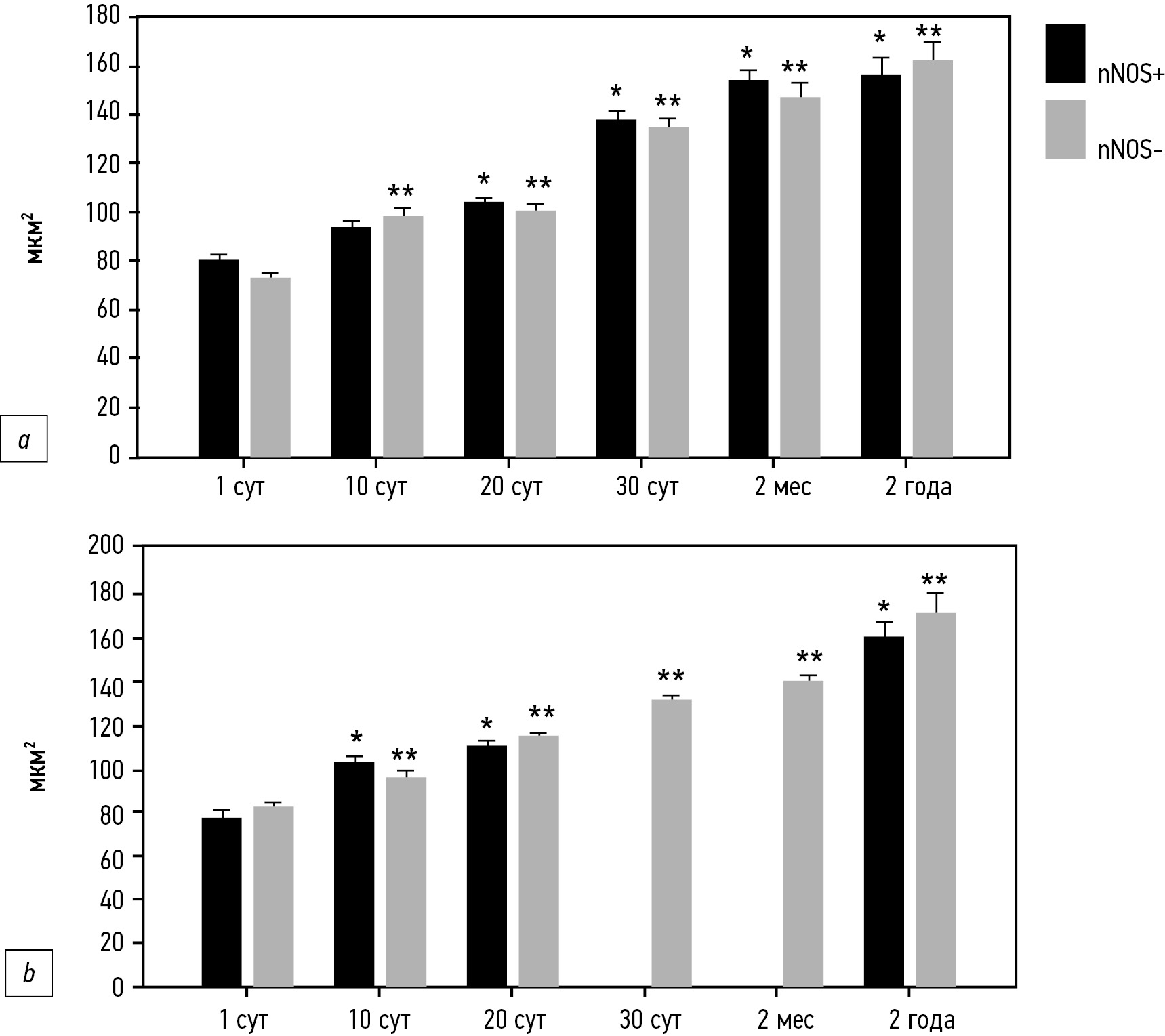 Рис. 2. Средние площади сечения нейронов, иммунореактивных (+) и негативных (–) к нейрональной синтазе оксида азота, в интрамуральных узлах межмышечного (а) и подслизистого (b) сплетения толстой кишки в онтогенезе. * p <0,05, различия статистически значимы по сравнению с иммунореактивными к нейрональной синтазе оксида азота нейронами новорождённого. ** p <0,05, различия статистически значимы по сравнению с негативными к нейрональной синтазе оксида азота нейронами новорождённого. / Fig. 2. Average cross-sectional areas of neurons immunoreactive (+) and negative (–) to neuronal nitric oxide synthase in the intramural ganglia of the intermuscular (a) and submucous (b) plexus of the large intestine during ontogenesis. *p <0.05, differences are significant in comparison with neurons immunoreactive to neuronal nitric oxide synthase in a newborn. **p <0.05, differences are significant in comparison with neurons negative to neuronal nitric oxide synthase in a newborn.