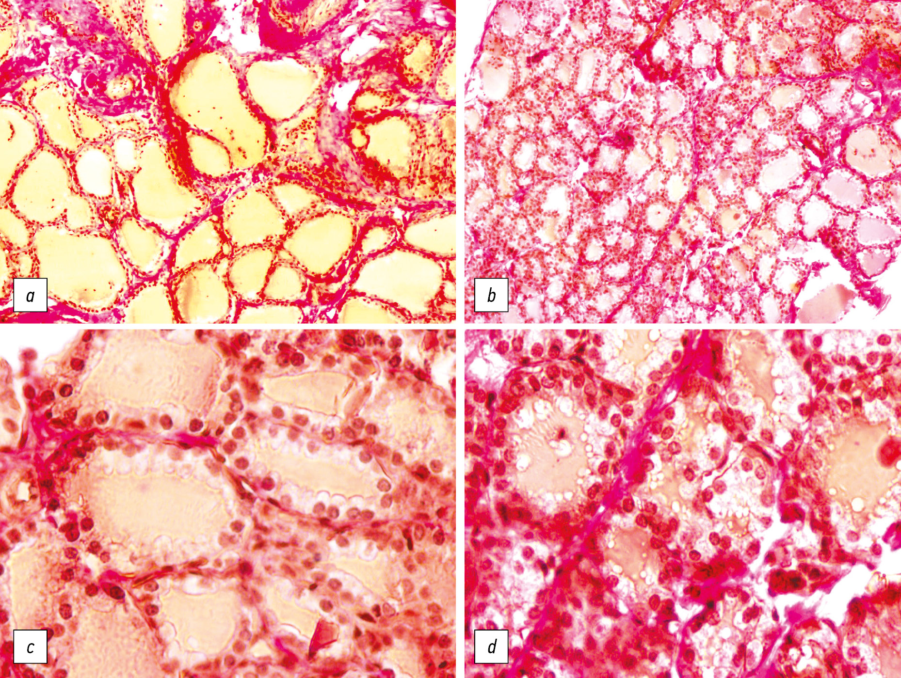 Рис. Микрофотография щитовидной железы контрольной крысы (а — ув. 200, с — ув. 800) и крысы, получавшей метионин (b — ув. 200, d — ув. 800). Окраска по Ван-Гизону.