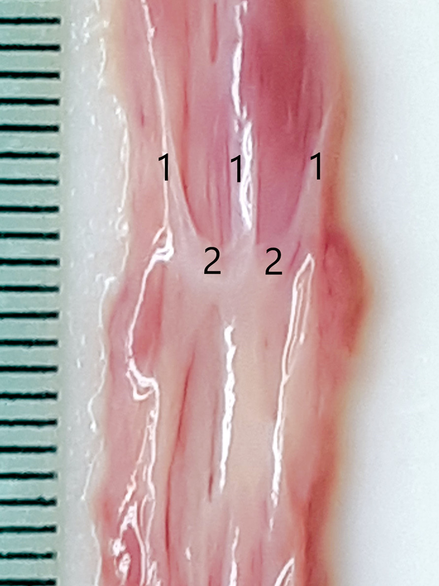 Рис. 1. Макрофотография фрагмента глубокой дорсальной вены. Отчётливо виден клапан, представленный двумя полулунными створками (2). Места фиксации клапана — клапанные валики (1). Рядом — линейка с ценой деления 1 мм.
