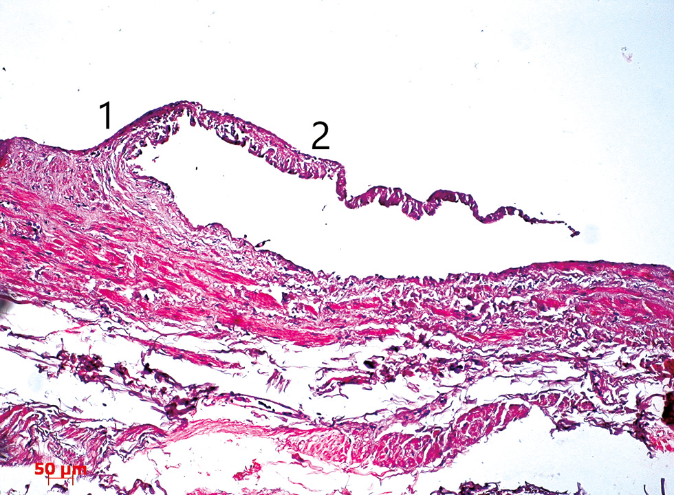 Рис. 2. Клапан глубокой дорсальной вены в продольном сечении представлен мощным клапанным валиком (1) и фрагментом створки (2). Окраска гематоксилин-эозином. Ув. ×200.