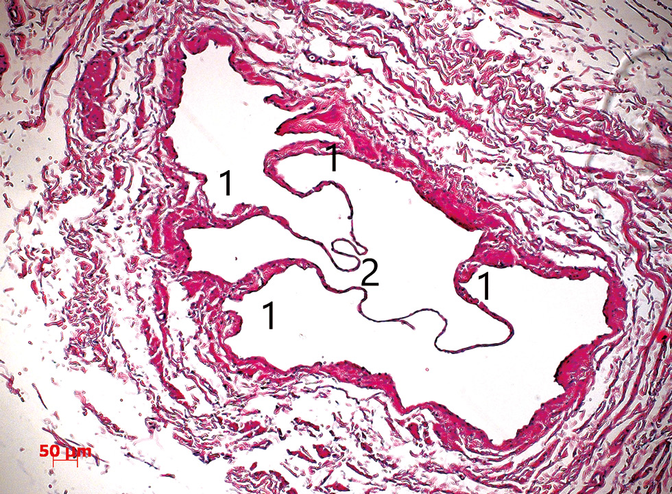 Рис. 3. Клапан глубокой дорсальной вены на поперечном срезе. Определяются клапанные валики (1) и створки (2). Окраска гематоксилин-эозином. Ув. ×100.