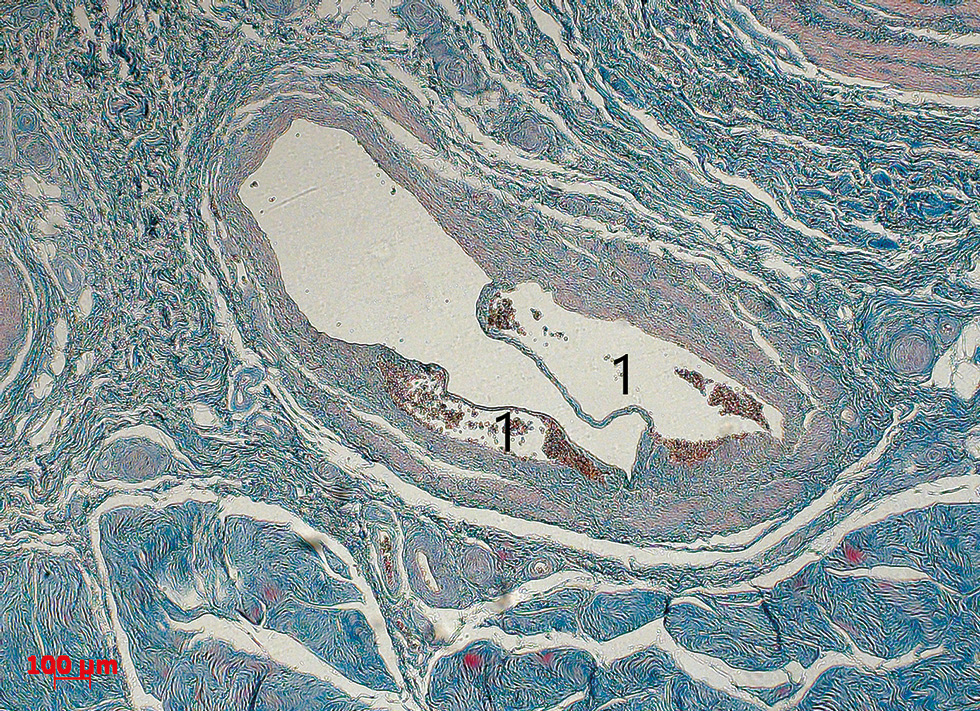 Рис. 4. Клапан глубокой дорсальной вены с частичным перекрытием просвета. В синусе клапана (1) скопления эритроцитов. Окраска по Маллори. Ув. ×50.