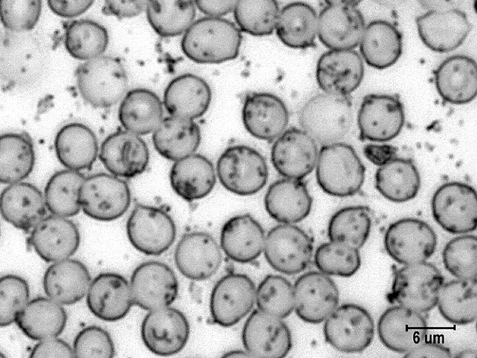 Рис. 3. Гранулы катехоламинов на поверхности эритроцитов в мазках крови крыс в условии острого стресса. Импрегнация азотнокислым серебром с докраской эозином. Ув. ×4000. / Fig. 3. Granules of catecholamines on the surface of erythrocytes in the blood smears of rats under acute stress. Impregnation with silver nitrate and final staining with eosin. Magnification, ×4000.