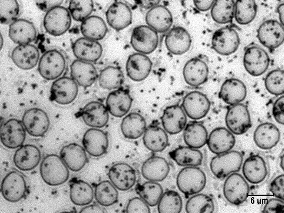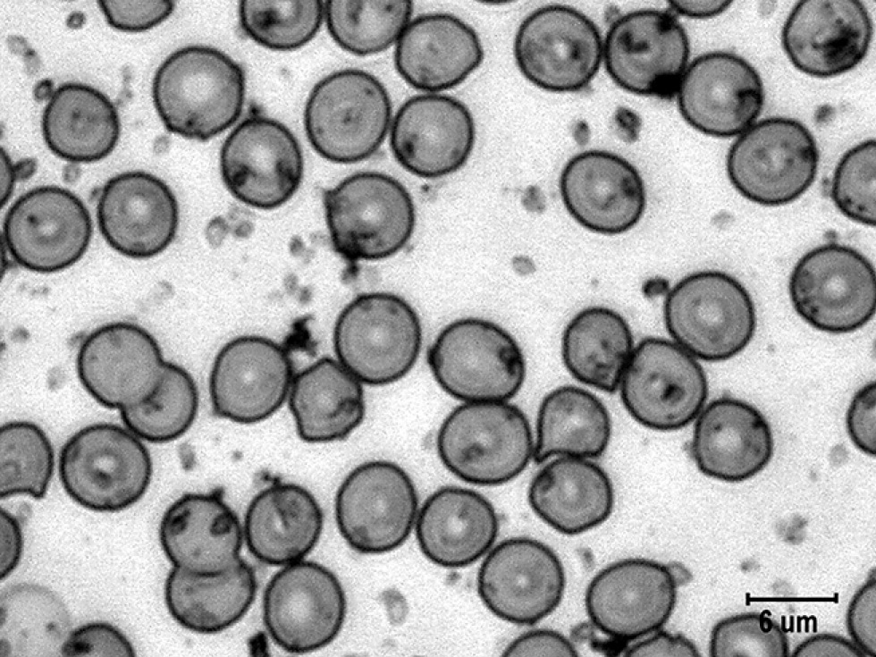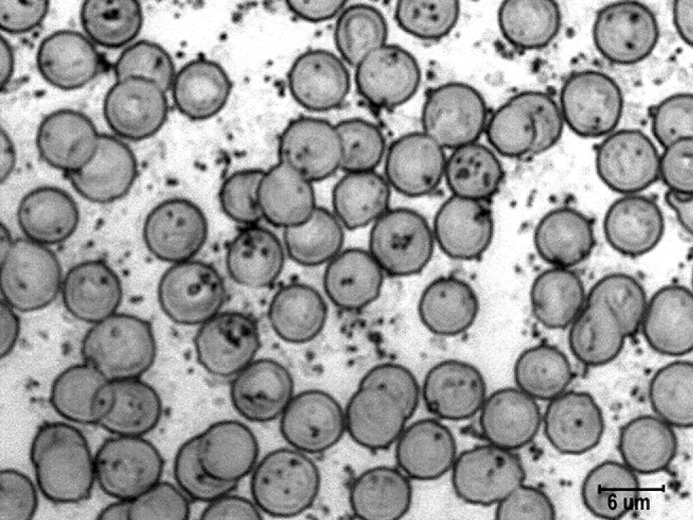 Рис. 6. Гранулы катехоламинов на поверхности эритроцитов в мазках крови крыс при остром стрессе на фоне стимуляции норадренергической системы. Импрегнация азотнокислым серебром с докраской эозином. Ув. ×4000. / Fig. 6. Granules of catecholamines on the surface of erythrocytes in the blood smears of rats under acute stress during the stimulation of the noradrenergic system. Impregnation with silver nitrate and final staining with eosin. Magnification, ×4000.