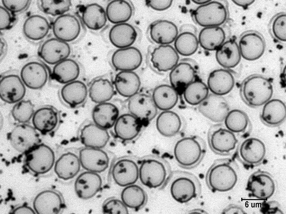Мазки крови готовили традиционным способом и фиксировали в концентрированных парах формалина в течение 2 мин. Затем выдерживали 40 мин в темноте при комнатной температуре в смеси, состоящей из следующих компонентов (мас. %): формалин — 10, бихромат калия — 3, ацетат натрия — 0,2, 1,5% раствор хлорида натрия — 85,9. Сразу после извлечения из фиксирующей среды мазки промывали дистиллированной водой и импрегнировали в 5% растворе азотнокислого серебра в течение 3 мин. После импрегнации мазки докрашивали 1% раствором эозина в течение 1 мин [1]. Затем мазки крови высушивали при комнатной температуре. Микроскопию проводили в проходящем свете на микроскопе Leica DM750 под масляной иммерсией при увеличении ×1000 c апертурой 1,25. На фоне светло-розовой цитоплазмы эритроцитов наблюдали гранулы тёмно-бурого цвета разного размера — гранулы катехоламинов.