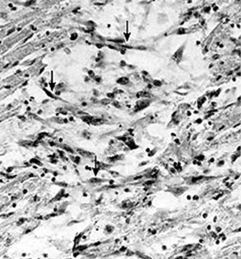Наряду с пролиферацией кардиомиоцитов на 2–4-е сутки после травмы в очаге повреждения и на границе с ним в сохранившейся ткани определялись низкодифференцированные структуры мышечного типа. В одних случаях это были концевые отделы повреждённых кардиомиоцитов на границе с участком повреждения, вдающиеся в участок травмы на некоторое расстояние. При этом они приобретали булавовидную форму, цитоплазма их окрашивалась эозином слабо и была полностью лишена исчерченности; концевые отделы этих образований содержали большое число ядер (рис. 1). В других случаях низкодифференцированные структуры представляли собой крупные клетки веретенообразной формы, лежащие в очаге повреждения. От фибробластов эти клетки отличались окраской цитоплазмы эозином и равномерно распределённым по крупному ядру нежным хроматином (в отличие от глыбчатого расположения хроматина в ядрах фибробластов). Эти образования очагово объединялись в группы, формируя цепочки (рис. 2).