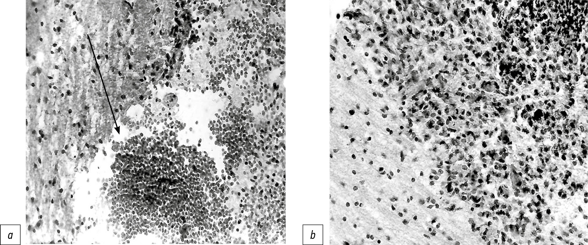 Рис. 3. Головной мозг плода кролика, травмированное полушарие: a — зона повреждения (1-е сутки после операции); b — участок мозговой ткани вблизи от зоны повреждения, пролиферация астроцитов с примесью небольшого количества молодых соединительнотканных клеток (5-е сутки после операции). Окраска гематоксилином и эозином, ×400.