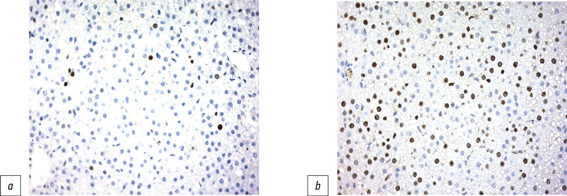 Рис. 4. Позитивная реакция ядерного белка Кi-67 в ядрах гепатоцитов, 7-е сутки после операции: а — контрольное животное; b — опытное животное. Иммунногистохимическое окрашивание, ×400.