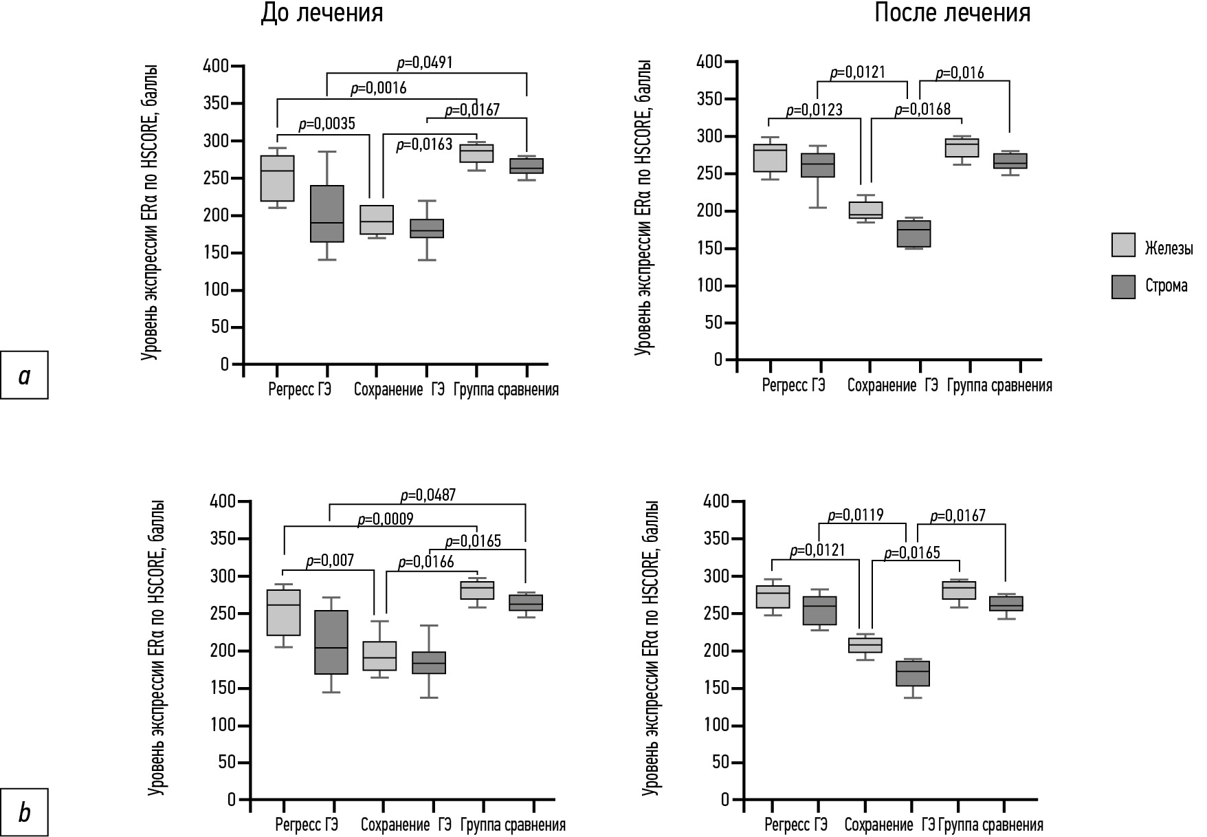 Рис. 1. Уровень иммуногистохимической экспрессии ERα в стромальном и железистом компартментах эндометрия у пациенток репродуктивного возраста с гиперплазией эндометрия (ГЭ) без атипии и аномальным маточным кровотечением: а — дидрогестерон (группа 1); b — норэтистерона ацетат (группа 2).