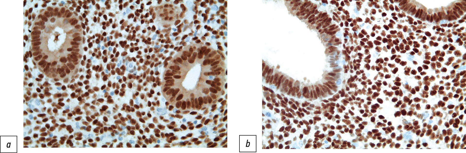Рис. 4. Иммуногистохимическая экспрессия PR в ткани гиперплазии эндометрия без атипии исходно в группе с эффективной терапией (а), неэффективной терапией (b) (ИГХ, ×400).