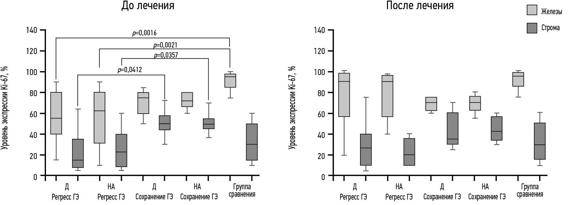 При первичном исследовании патологической ткани ГЭ методом иммуногистохимии выявлено, что значения экспрессии ERα в железистом компартменте находились в диапазоне от 165 до 290 баллов и составляли в среднем 227,1±39,3 балла, что было статистически значимо ниже данных группы сравнения, где средний показатель соответствовал 283,1±12,0 балла. В стромальном компартменте эндометрия экспрессия ERα была от 138 до 285 баллов, в среднем составляла 192,1±36,8 балла, что было статистически значимо ниже показателей группы сравнения, где средний показатель составлял 264,4±10,2 балла. Уровень экспрессии ядерных рецепторов прогестерона у пациенток с ГЭ в железистом компартменте колебался от 195 до 285 баллов (среднее значение — 242,4±29,8 балла), что было статистически значимо ниже данных группы сравнения (267,86±7,90 балла). В стромальном компартменте экспрессия PR в патологической ткани составляла в среднем 220,4±24,4 балла (от 175 до 260) и была статистически значимо ниже, чем в группе сравнения (251,1±17,5 балла). Уровень экспрессии Ki-67 у пациенток с ГЭ в железистом компартменте составлял 75–100% (в среднем — 61,80±20,89%), в группе сравнения — 91,43±8,23%, причём последнее значение было статистически значимо выше показателей патологической ткани ГЭ. В стромальном компартменте этот показатель колебался от 5 до 73% в среднем составлял 38,8±21,7%, в группе сравнения — 31,1±17,8%, различия не достигли порога статистической значимости.