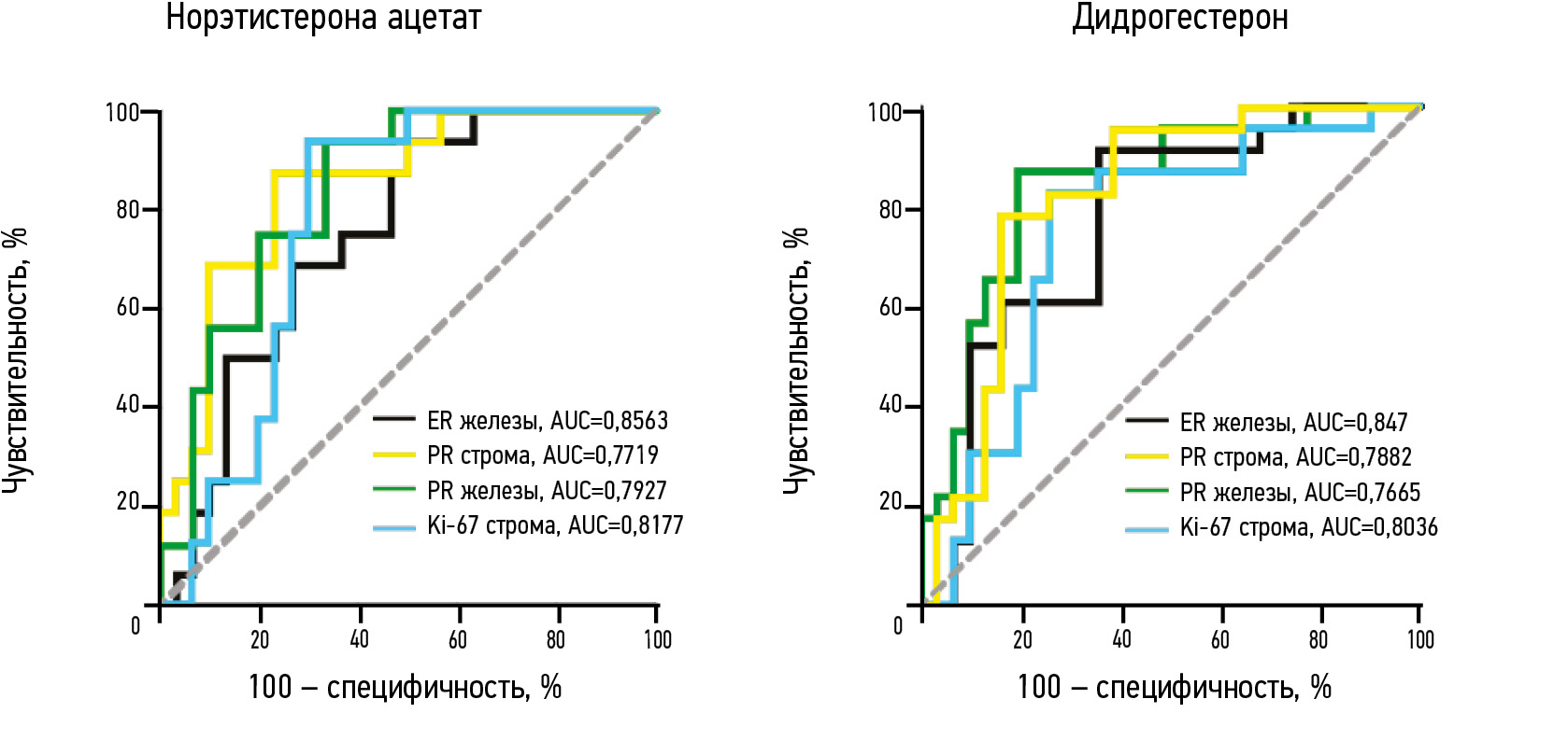 Известно о взаимном влиянии стероидных гормонов на экспрессию рецепторов, поэтому мы исследовали связь между маркёрами. Для этого были построены уравнения логистической регрессии с использованием отобранных ИГХ-маркёров в различных комбинациях, а также с включением в модель препарата, применяемого при лечении. Выявлено, что на прогностическую способность модели не влияет выбор препарата. Это означает, что эффективность терапии в нашей выборке зависела только от исходных параметров пациентки: уровня экспрессии ERα в железах, PR — в строме и в железах эндометрия, Ki-67 — в строме эндометрия.