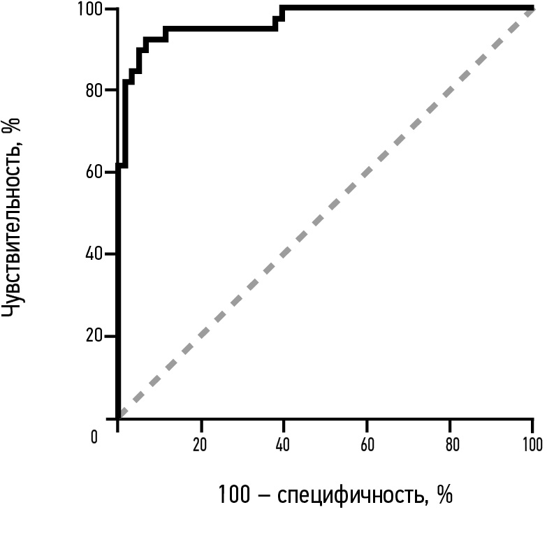 ROC-кривая характеризовалась значением AUC=0,969±0,016 (95% ДИ: 0,938–1,000), чувствительность — 89,74%, специфичность — 95,08%, т.е. прогнозирование результатов теста является точным и прогностическая способность модели оценивается как «отличная».