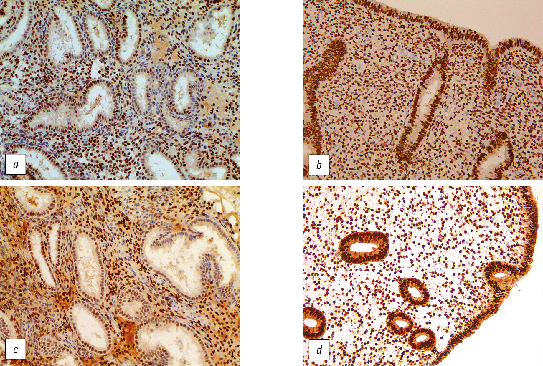 Рис. 2. Иммуногистохимическое исследование с антителами к эстрогеновым (ER) и прогестероновым (PR) рецепторам у пациенток с серозной цистаденомой яичников: a — низкое содержание ER в железистом и стромальном компонентах эндометрия до операции; b — повышение экспрессии ER в железах и строме после операции; c — снижение уровня PR в железах и строме слизистой оболочки матки до операции; d — нормальная экспрессия PR в железистом и стромальном компонентах эндометрия после операции.