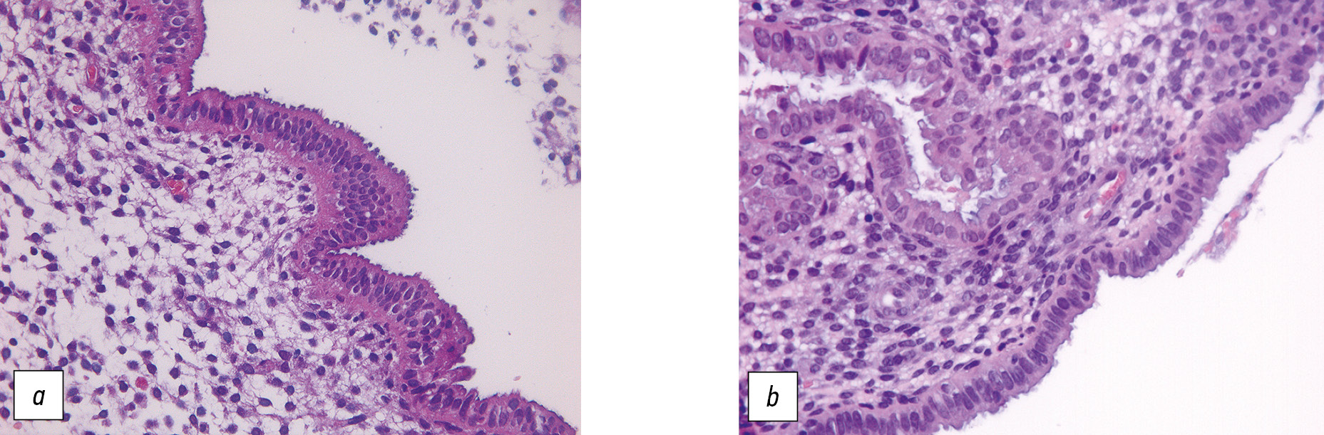 Fig. 3. Endometrial pinopodium in patients with ovarian mucinous cystadenoma: a — developing pinopodium (50–60%) on the surface of the epithelium before surgery; b — 6–12 months after the operation, there are developing pinopodiums on the surface of the epithelium (30–40%).