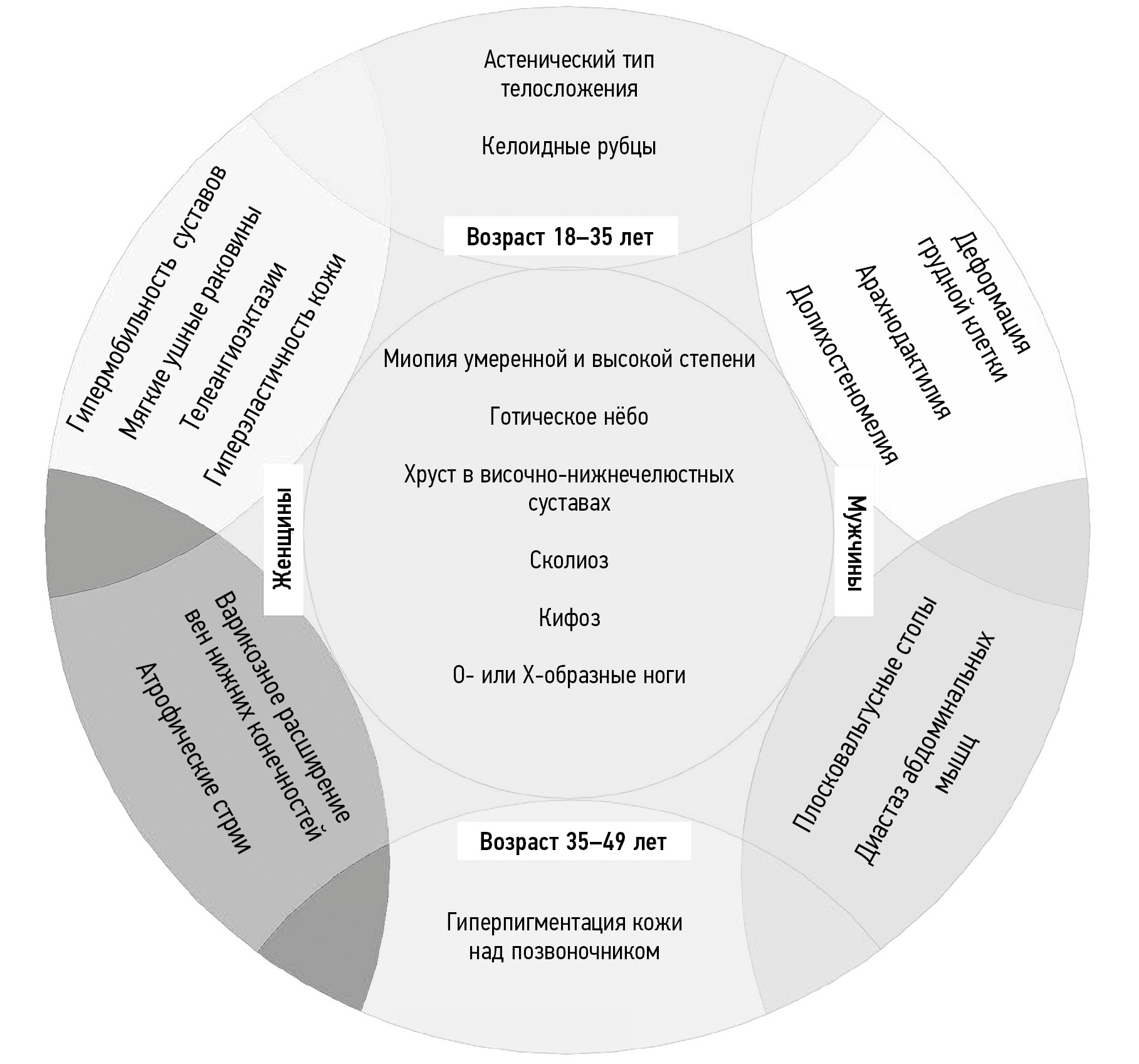 Обнаруженные диспластические проявления имели значимые возрастно-половые различия. Гипермобильность суставов и астенические пропорции тела, выявленные согласно индексам Вервека, Пинье, Варги и Кетле, существенно чаще встречались у женщин. С возрастом частота встречаемости этих признаков статистически значимо снижалась (см. табл. 1). У мужчин в большем проценте случаев отмечены непропорционально более длинные пальцы, кисти и стопы, что свидетельствовало о наличии у них признаков арахнодактилии и долихостеномелии (табл. 2). Кроме того, у них чаще наблюдались плосковальгусные стопы, воронкообразная или килевидная деформации грудной клетки. Встречаемость увеличенного соотношения длины кисти/стопы к росту была существенно выше у пациентов второй возрастной группы. Показано, что среди миоэктодермальных диспластических проявлений для женщин в большей степени было характерно наличие тонкой гиперэластичной кожи, избыточно мягких ушных раковин, атрофических стрий, телеангиоэктазий, варикозно расширенных вен нижних конечностей, изменений волос и ногтей (табл. 3). В процессе онтогенеза отмечено уменьшение гиперэластичности кожи и ушных раковин, а также значимое увеличение процента встречаемости атрофических стрий, гиперпигментации кожи, изменений волос и ногтей. Келоидные рубцы чаще наблюдались в молодом возрасте независимо от пола. Для мужчин более типичным было наличие таких клинически значимых стигм, как диастаз абдоминальных мышц и рецидивирующие грыжи, процент выявляемости которых существенно увеличивался с возрастом. Особо следует отметить, что у большинства обследованных имела место миопия умеренной и высокой степени, которая манифестировала уже в молодом возрасте и далее прогрессировала выраженность её проявлений.