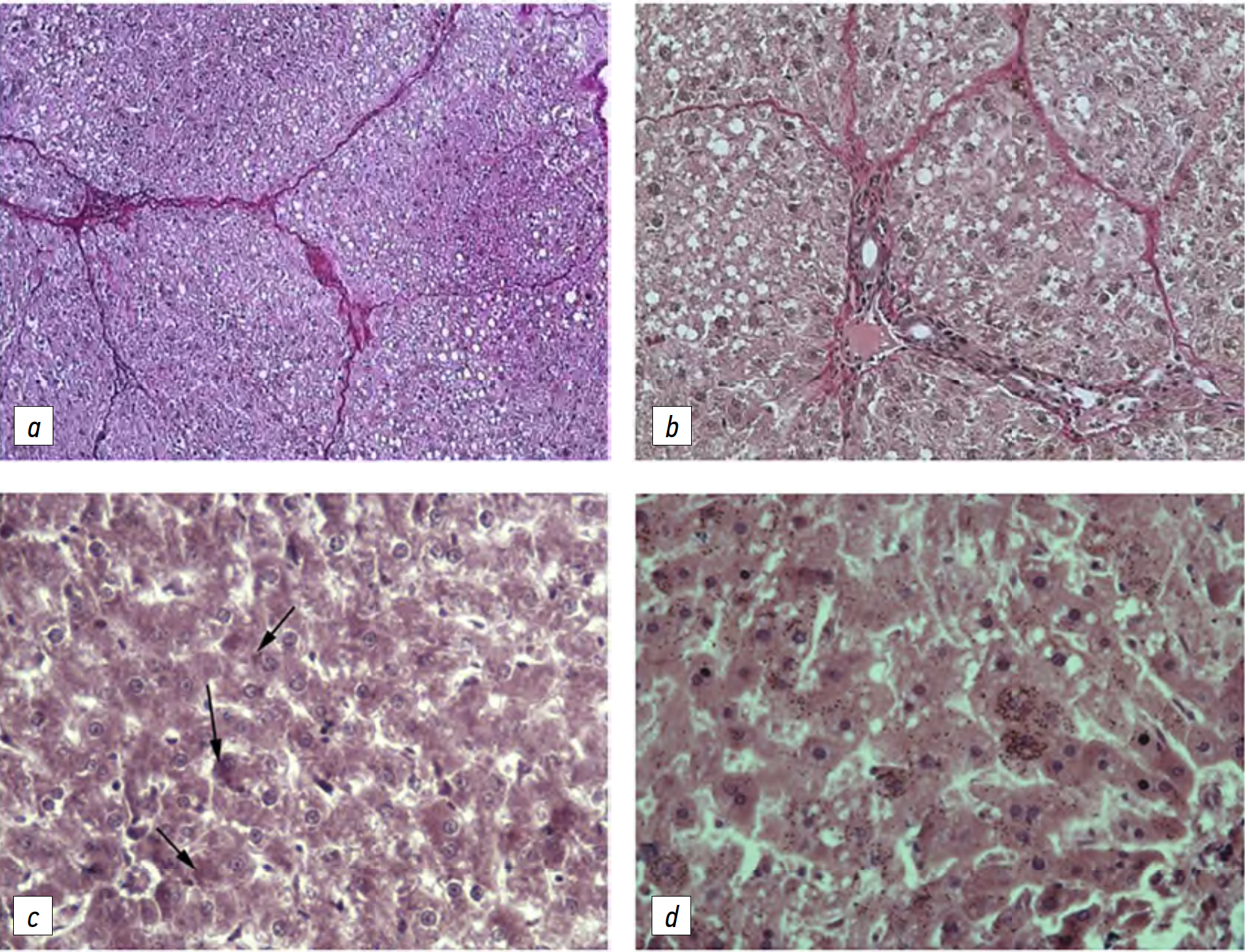 Fig. 6. Liver of rats of the 4th group (♂, dark deprivation + chronic alcohol intoxication): a, b — Van Gieson–Fouche staining [19]; c, d — hematoxylin and eosin staining [20]; a — ×200, b, c, d — ×400. In Fig. c arrows indicate Mallory–Denk bodies.