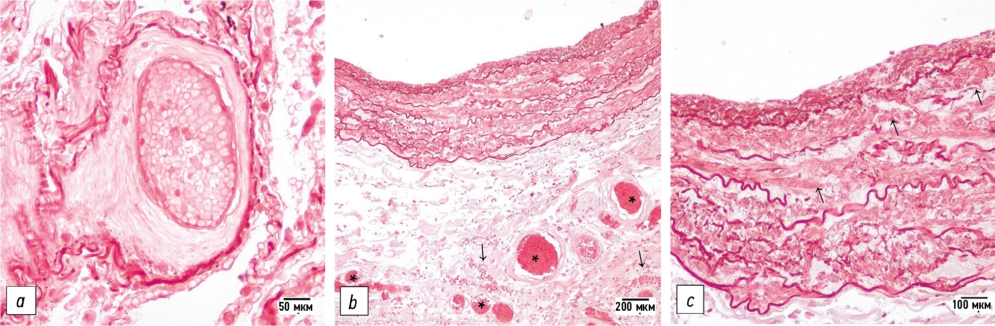 2. Fig. 1. A cross section of the arteries of the small circulatory circle: a — edema and dilution of the t. media of the small artery with displacement of the outer elastic membrane; b — edema and destruction of the elastic framework of the t. media major artery (arrows), stasis in the vasa vasorum adventitia (asterisks), with foci of hemorrhage around them (arrows), pronounced perivascular edema with dissociation of connective tissue fibers; с — edema of the t. media major artery. Оrcein stain; a — ×400; b — ×100; с — ×200
