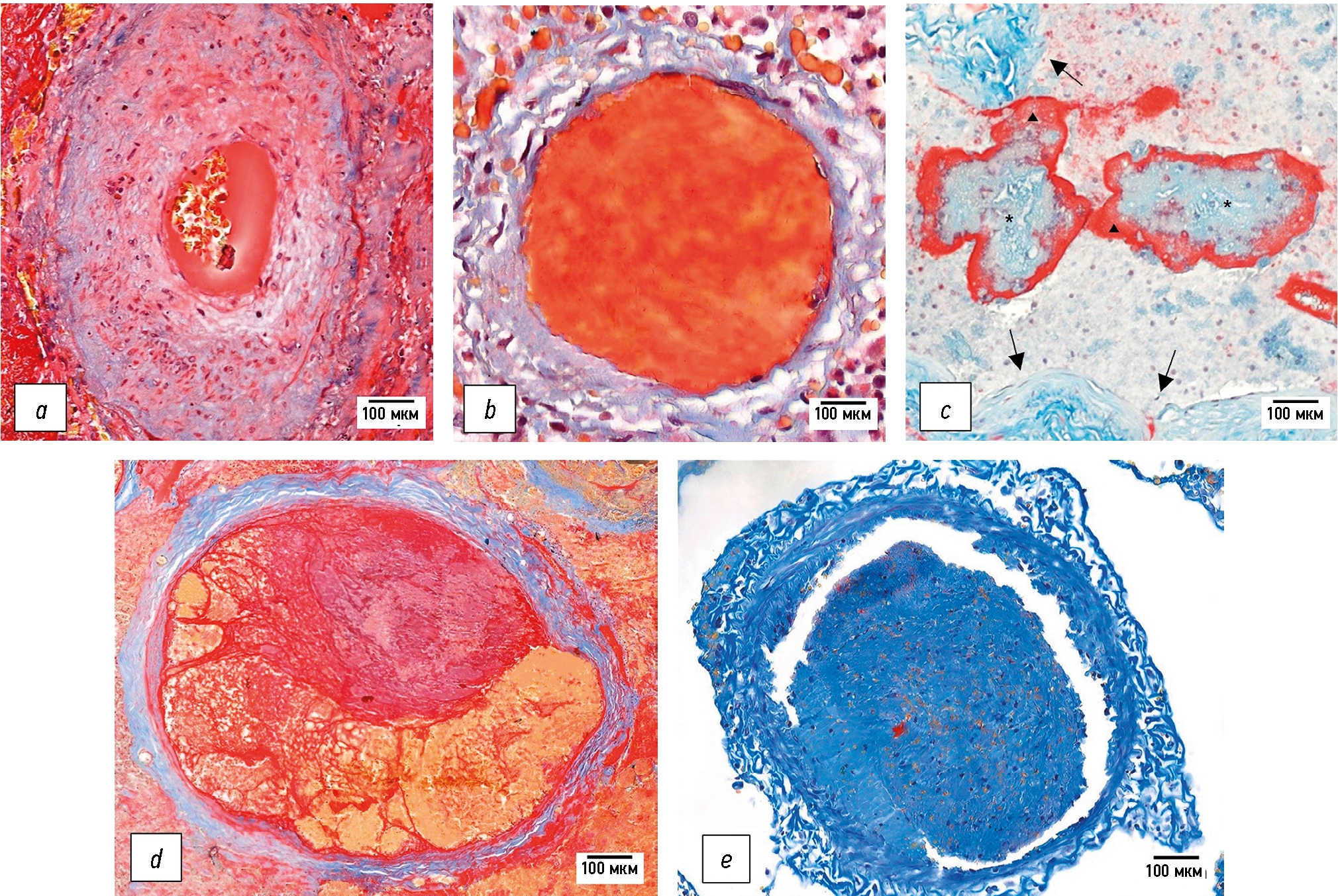3. Fig. 2. Blood clots in the lumen of pulmonary vessels in those who died from a new coronavirus infection: a — sludge and hyaline thrombus in a vessel with a sharply hypertrophied wall; b — a fresh thrombus covering 100% of the vessel lumen; с — "growing" thromboembolism in the lumen of the lung vessel, the "old core" of the thrombus (asterisks), on which fresh fibrin is layered (triangles), the walls of the vessel (arrows); d — a thrombus consisting of fragments of various prescription; e — an "old" thrombus (>24 hours). Fibrin staining using Martius Scarlet Blue (MSB) technology by Lendrum; ×200