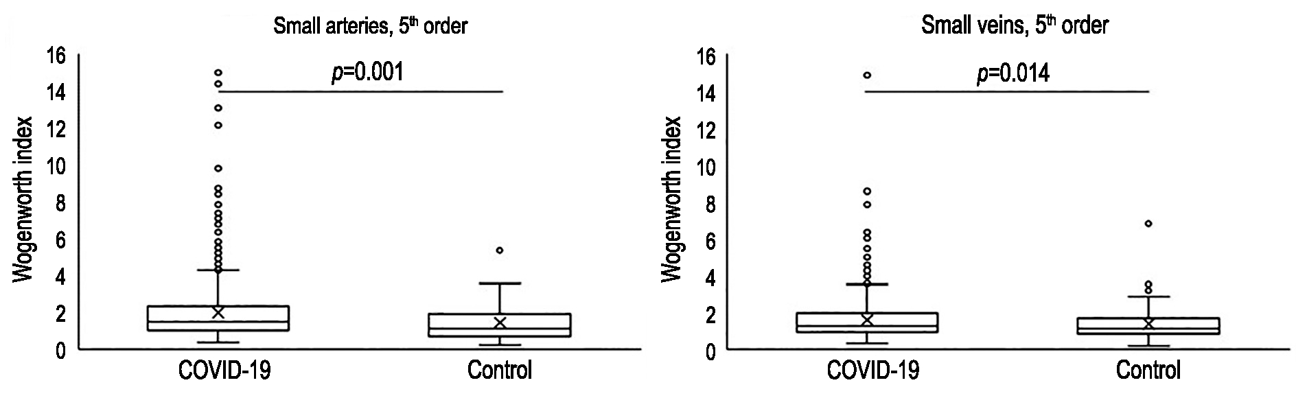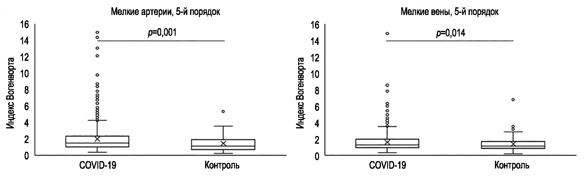 5. Fig. 4. The Vogenworth index in small arteries and veins of the 5th order in those who died from a new coronavirus infection and the control group according to the size of the vessels, depending on their order and internal diameter.