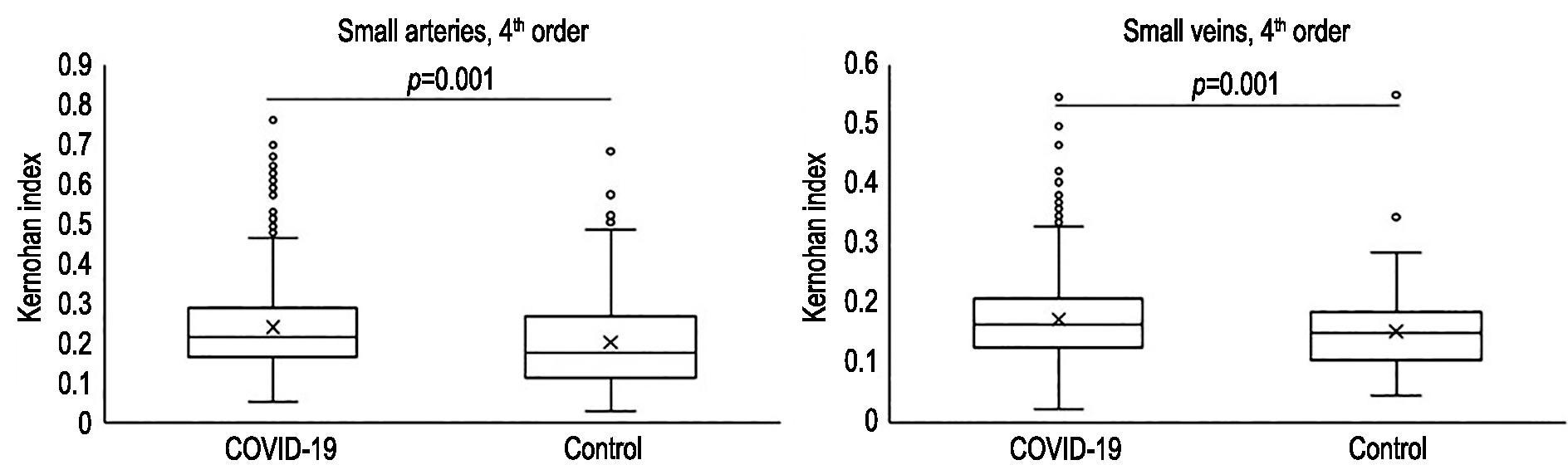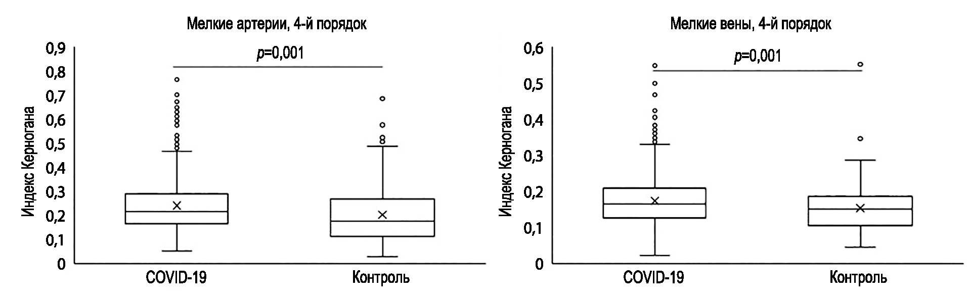 4. Fig. 3. Kernogan index in small arteries and veins of the 4th order in patients who died from a new coronavirus infection and the control group according to the size of the vessels, depending on their order and internal diameter.