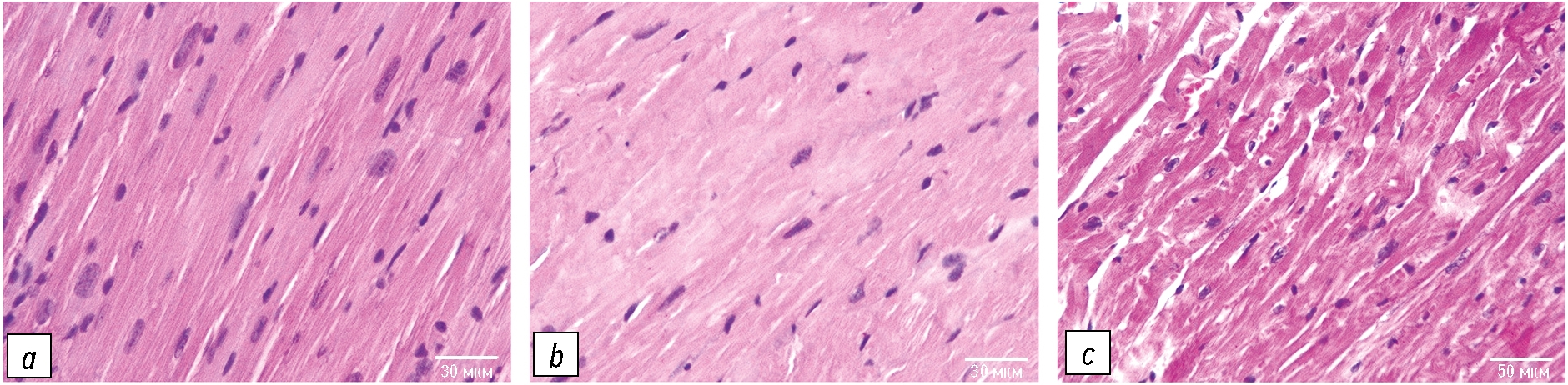 The cardiomyocytes were characterized by morphometric accounting of three parameters, namely, the distance between the intercalated discs (length), thickness, and perimeter of the nuclei (2D format in the AxioVision v. 4.9.1 program, USA).