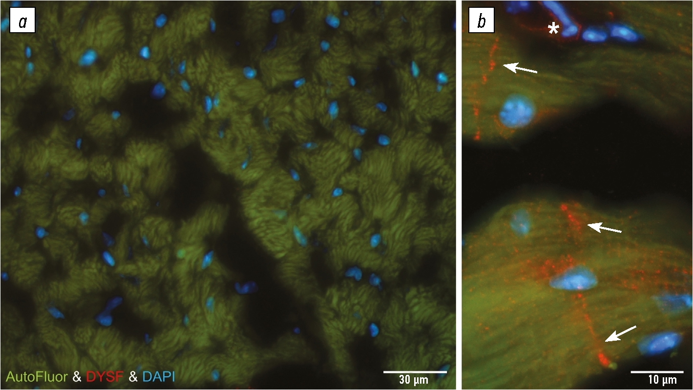 Fig. 4. Immunofluorescent reaction with dysferlin antynody: a — cross section of Bla/J mice cardiomyocytes; b — axial section Balb/C mice, the product of the reaction has perinuclear localisation and intercalated disks sites (→) and in endothelium (*). Green spectrum fluorescence is auto fluorescence of the cytoskeleton, red spectrum fluorescence is fluorescence of the detection system, blue spectrum fluorescence is nuclear coloring with DAPI; а — ×400; b — ×1000.