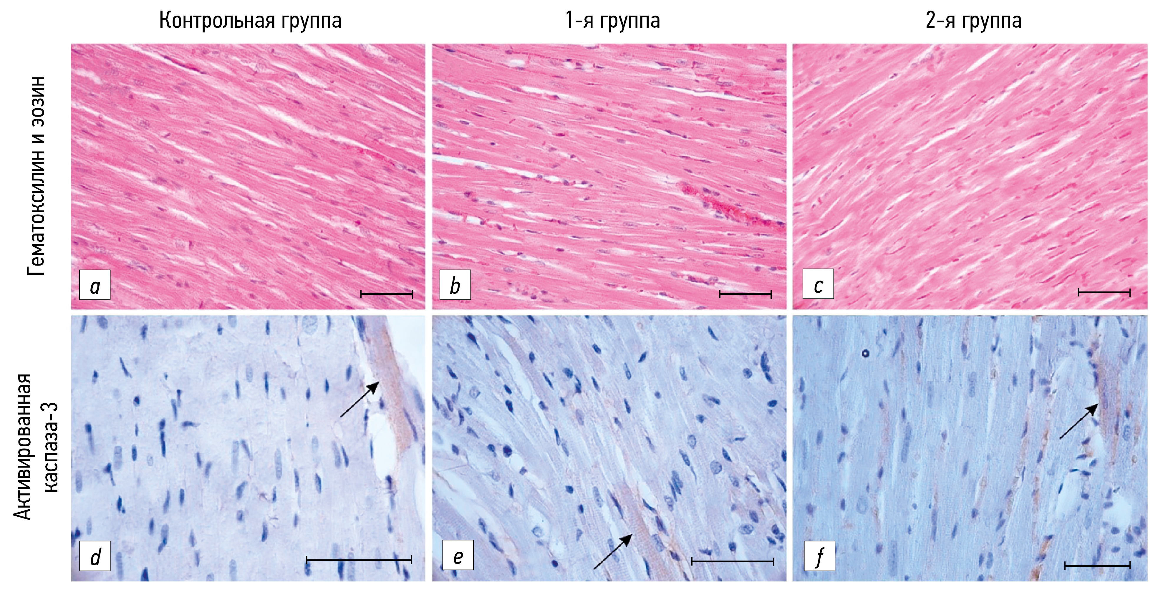 Рис. 1. Миокард левого желудочка самцов крыс контрольной, 1-й и 2-й групп, 180-е сутки постнатального периода онтогенеза; окраска гематоксилином и эозином, ×400 (a–c); иммуногистохимическое выявление активированной каспазы-3, докраска гематоксилином Джилла; ×630 (d–f). Стрелка указывает на иммунопозитивные кардиомиоциты. Бар — 50 мкм.