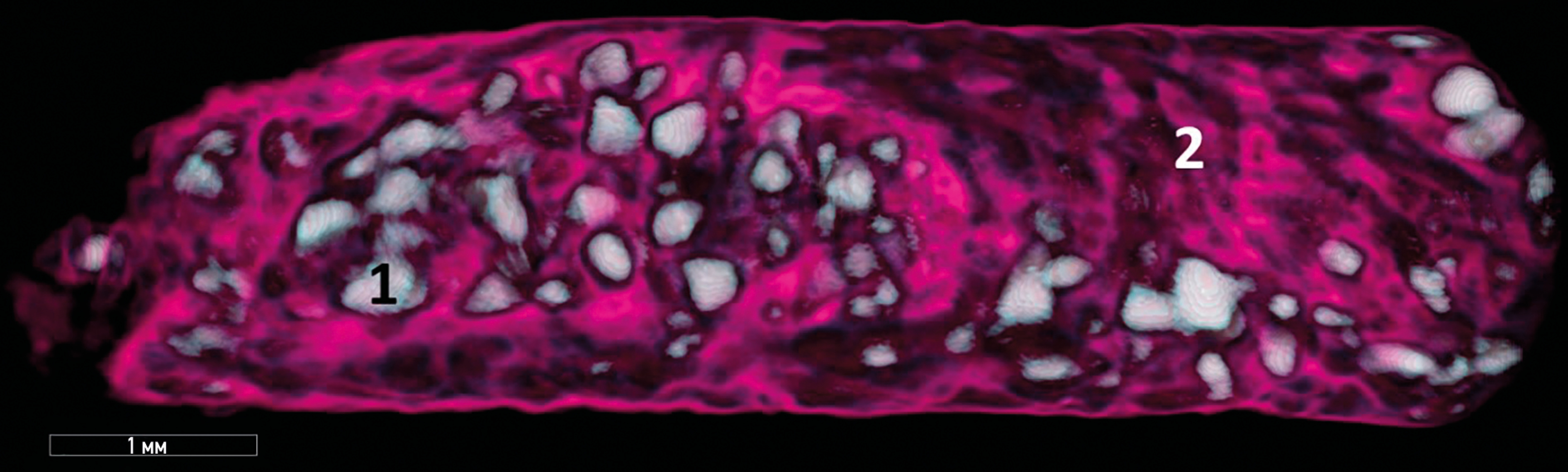 Рис. 1. Компьютерная томограмма, показывающая распределение гранул остеопластического материала в биоптате: 1 — фрагменты материала «Гистографт»; 2 — костный регенерат. Бар — 1 мм.