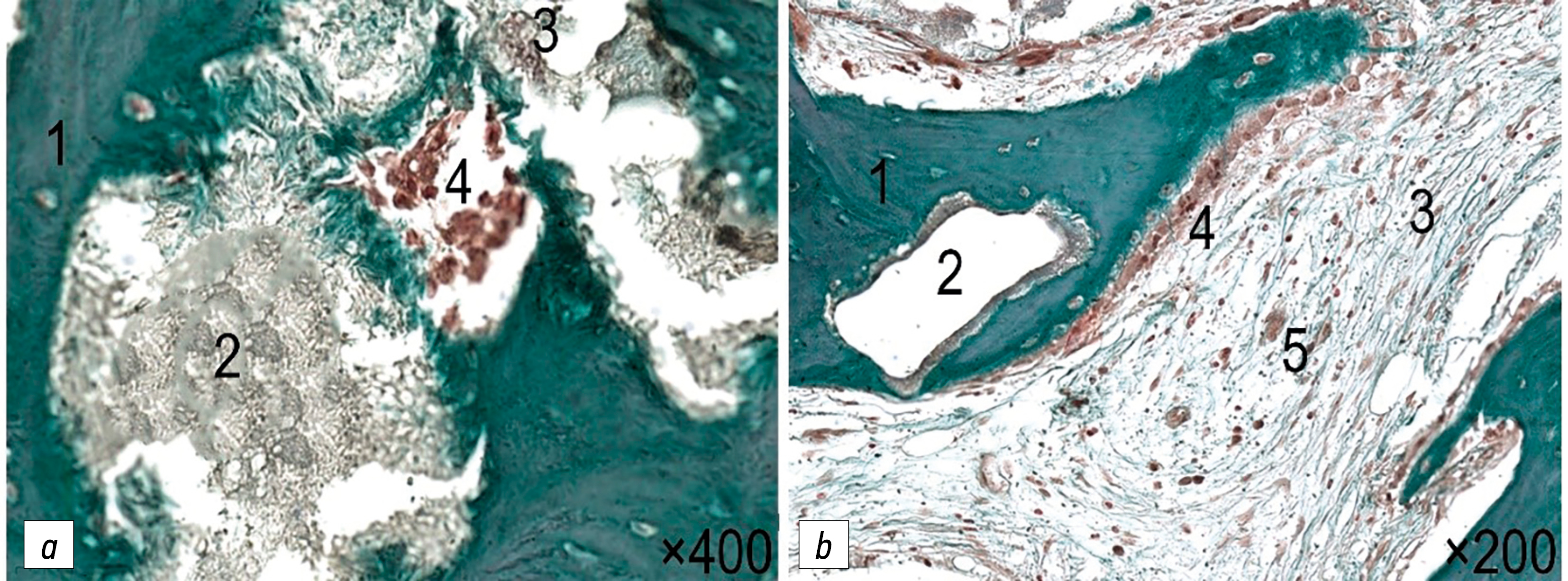 Костные биоптаты с имплантированным ГАМ представлены мультитканевым регенератом, состоящим из костной ткани смешанного типа, волокнистой соединительной ткани, а также фрагментов ОКФ. Микрогранулы изделия в большинстве случаев были диффузно распространены по всей площади гистологического микропрепарата и окружены сетью трабекул костной ткани смешанного строения (рис. 2, b). Большая часть гранул через 6 мес была полностью замкнута в балочной системе — поверхность ОКФ плотно соприкасалась с вновь образованной пластинчатой костной тканью. Однако встречались гранулы, на поверхности которых были сформированы остеоид и тонкие трабекулы ретикулофиброзной костной ткани (рис. 2, d).