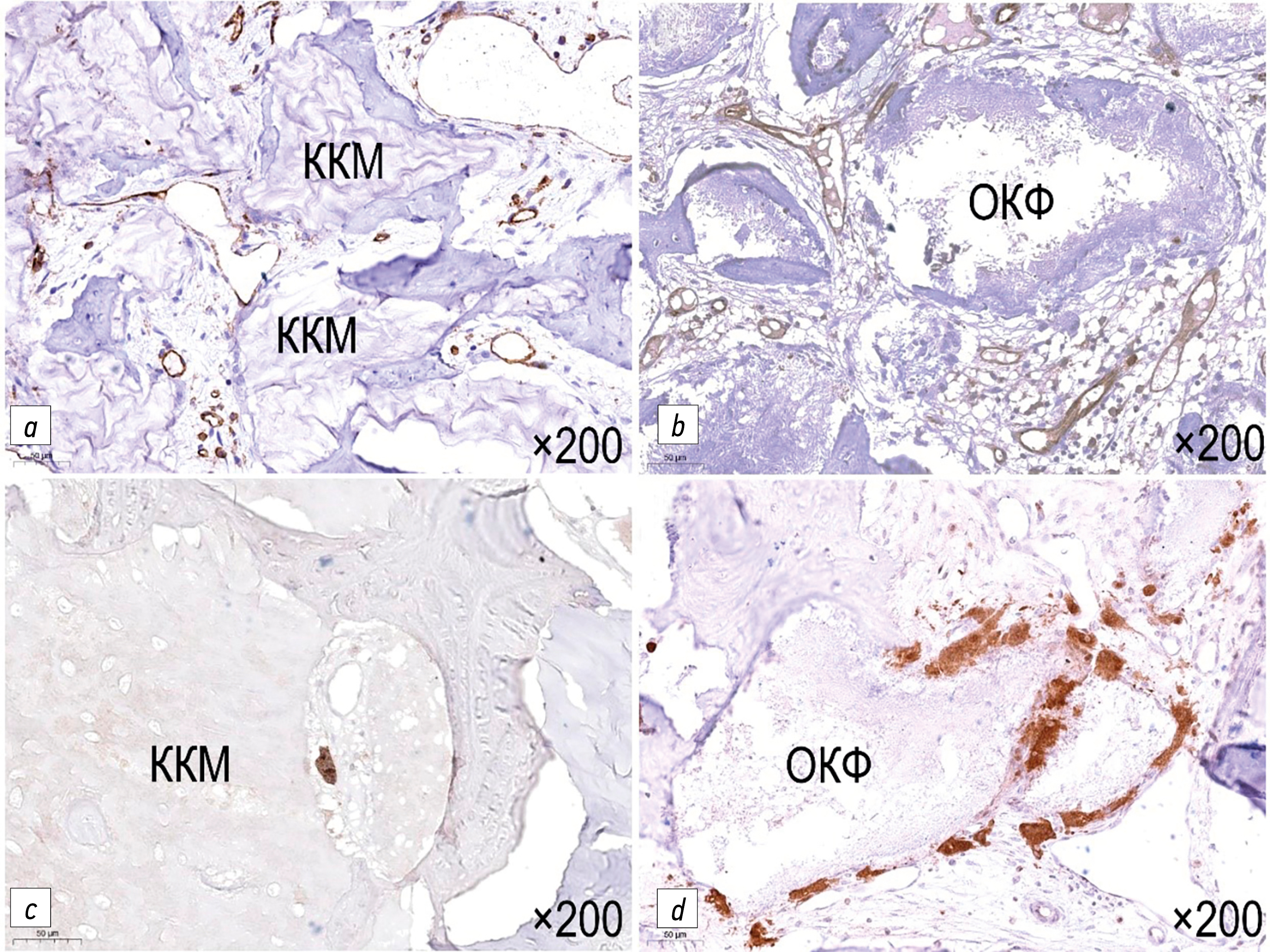 При иммуногистохимическом исследовании на эндотелиоциты (CD31) выявлена богато развитая кровеносная сеть, включающая все звенья микроциркуляторного русла от артериол до венул и более крупных сосудов во всём исследуемом костном регенерате. Как при использовании ГАМ, так и при использовании материала на основе ККМ кровеносные сосуды располагались в волокнистой соединительной ткани, окружающей костнозамещающие материалы и заполняющей межбалочные пространства. Проникновения кровеносных сосудов непосредственно в толщу фрагментов остеопластических графтов не выявлено (рис. 4, a, b).