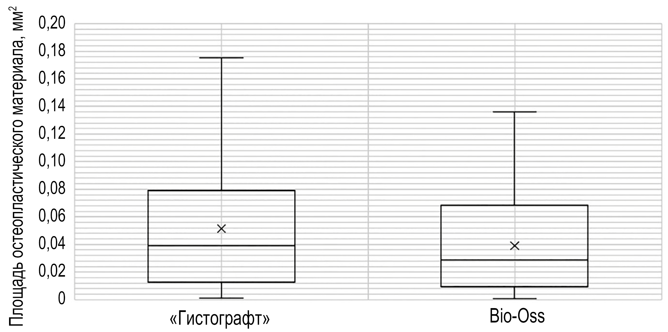 Рис. 5. Площадь нерезорбированных фрагментов остеопластических материалов через 6 мес после имплантации: Bio-Oss — ординарные изделия на основе ксеногенного костного матрикса; «Гистографт» — ген-активированные синтетические изделия на основе октакальциевого фосфата.