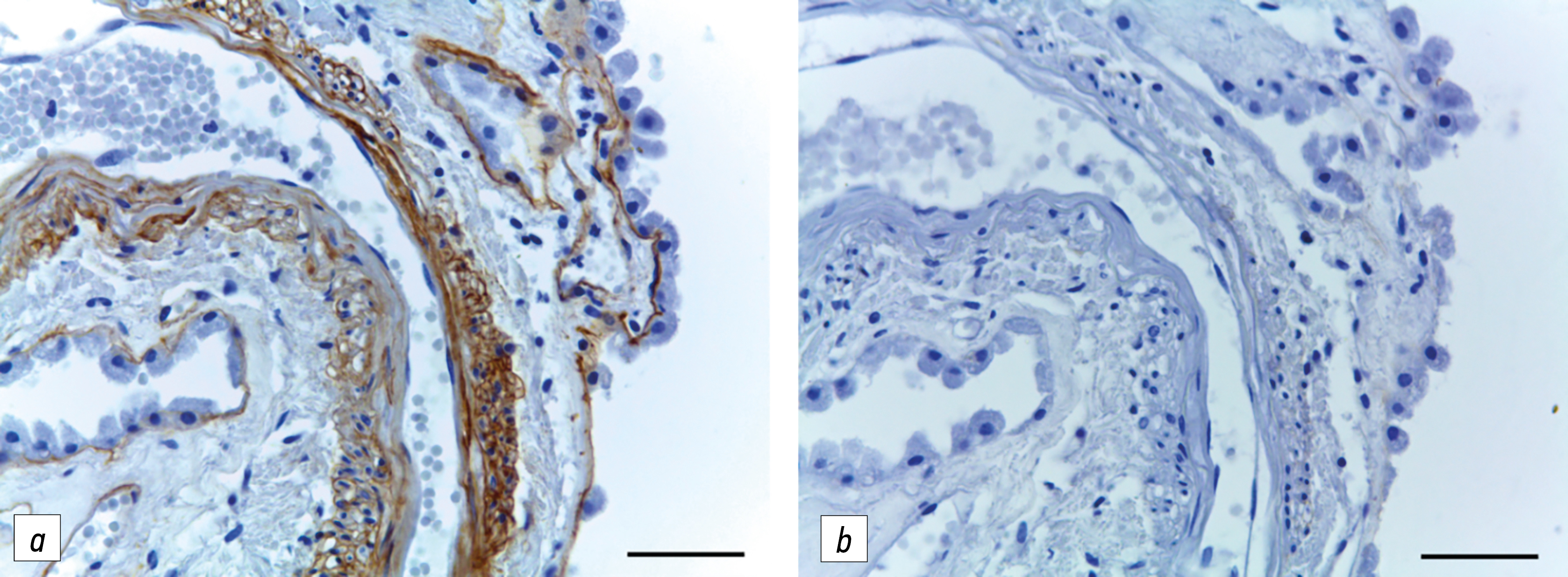 Fig. 1. Choroid plexus of the human brain: a ― immunohistochemical reaction to type IV collagen; b ― negative control (without primary antibody). Counter-staining with hematoxylin. Scale bar 50 μm.
