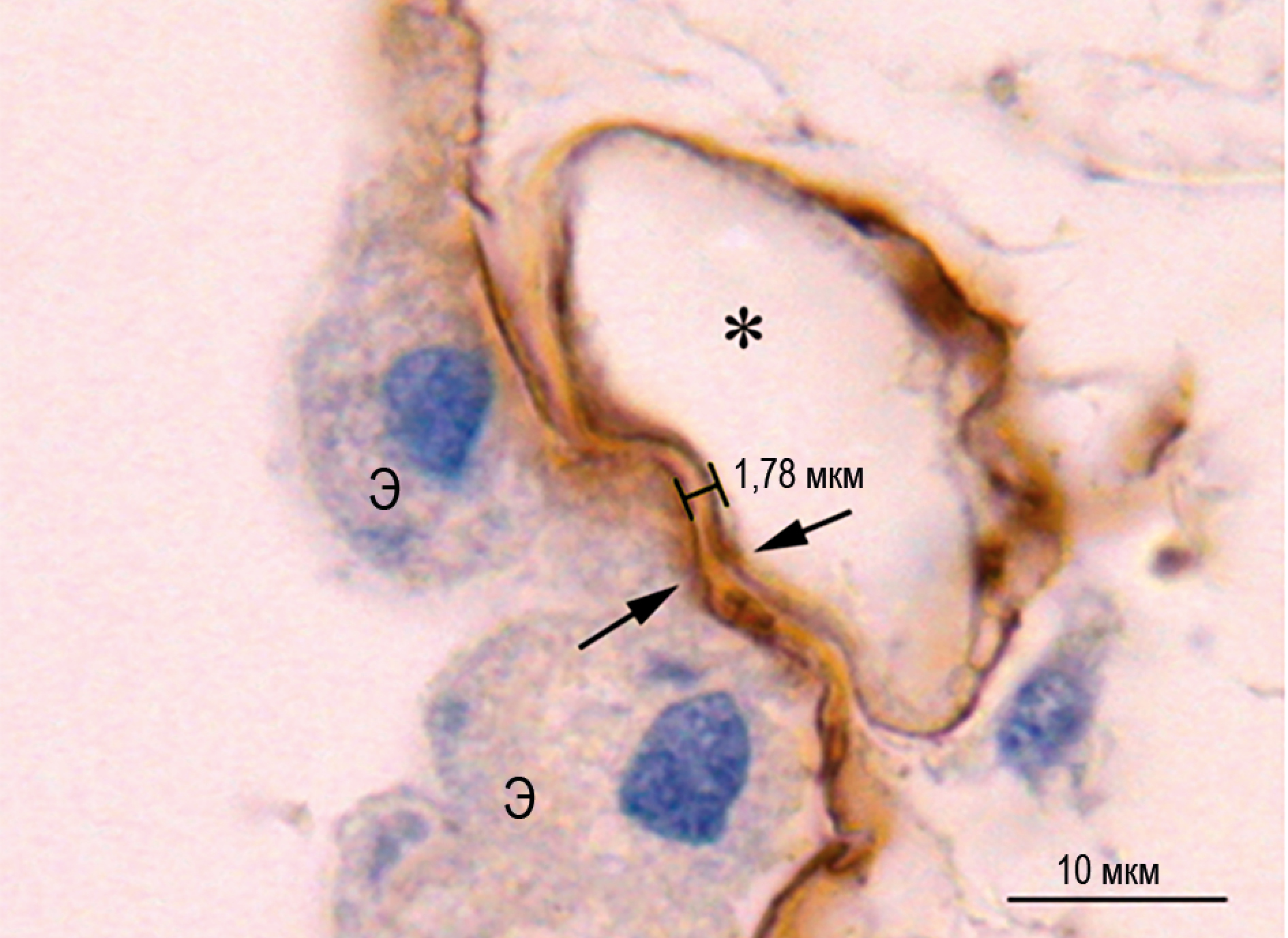 Fig. 3. Blood vessel in the subepithelial area of the choroid plexus villi. Arrows indicate the subepithelial and subendothelial basement membranes; the segment shows the distance between the BMs equal to 1.78 µm; the asterisk indicates the lumen of the blood vessel; Э ― villous epithelial cells. Immunohistochemical reaction to type IV collagen. Counter-staining with hematoxylin.