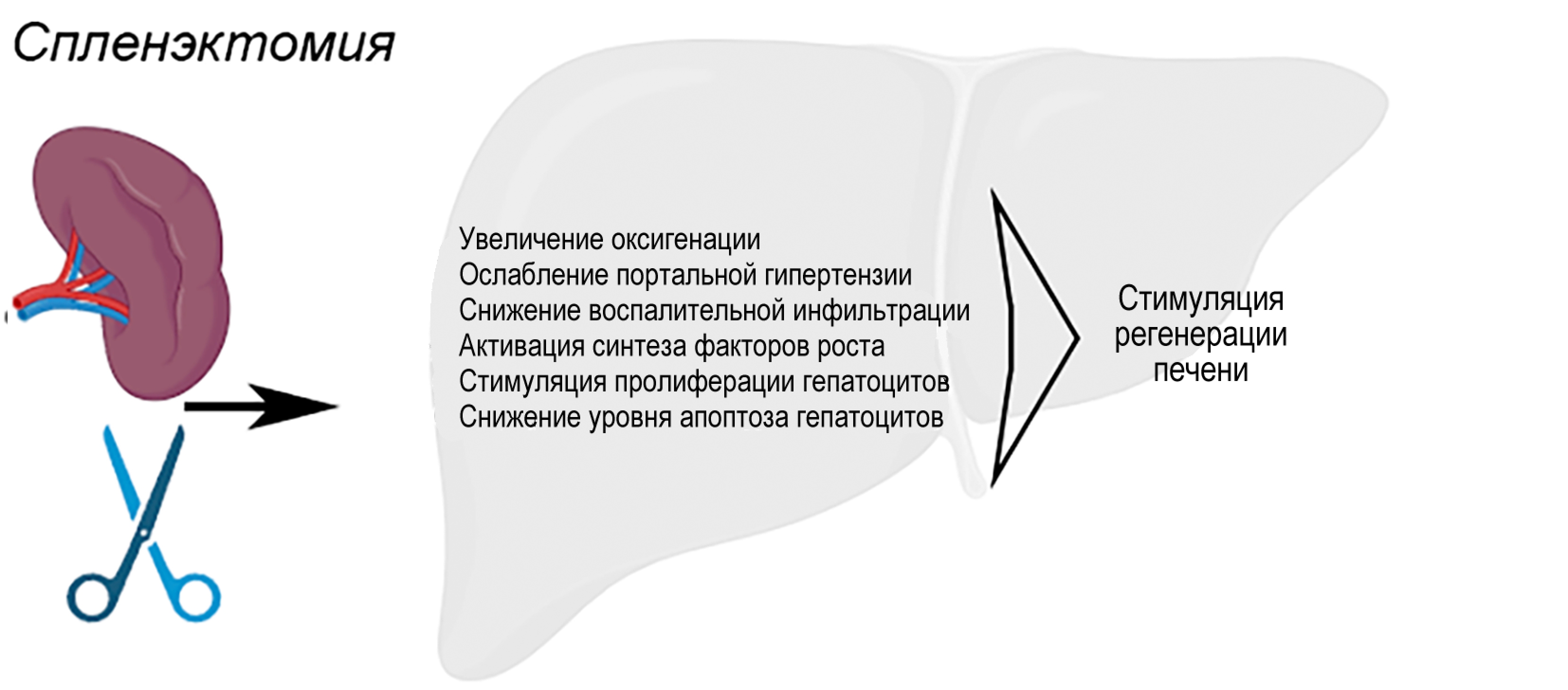 The spleen has a significant effect on the course of reparative processes in the liver. In most cases, this is demonstrated by splenectomy, which has a stimulating effect on the reparative processes in this organ. Depending on the nature of the liver damage, the effect of splenectomy is manifested through different mechanisms, namely a change in blood pressure in the portal vein, a decrease in the level of incoming cytokines and the number of leukocytes. However, not all studies have revealed a positive effect of splenectomy. The reasons for the contradictions are still unclear.
