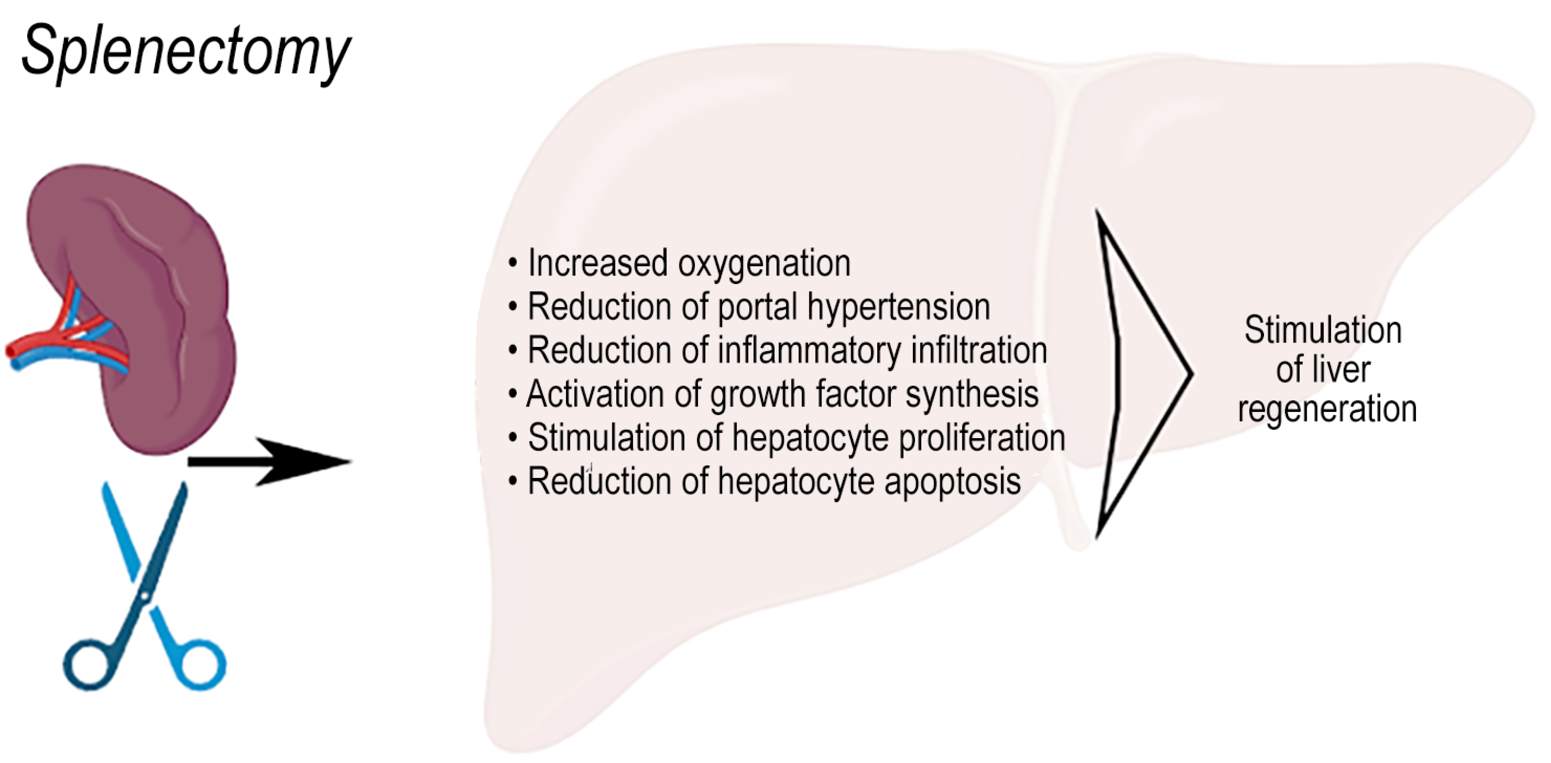 Splenectomy also influences the effectiveness of the methods used to treat liver pathology. It was demonstrated in the study by T. Iwamoto et al. that splenectomy enhanced the repopulation of bone marrow cells in the liver affected by cirrhosis, which led to a decrease in collagen deposition in it. According to the authors, this effect is due to an increase in the expression of MMP9 (matrix metalloproteinase 9) in transplanted bone marrow cells [25]. In addition, it has been established that splenectomy increases the efficiency of transplantation of mesenchymal stem cells obtained from adipose tissue into the liver by increasing the expression of SDF-1 (stromal cell-derived factor-1) and HGF in the liver [26].
