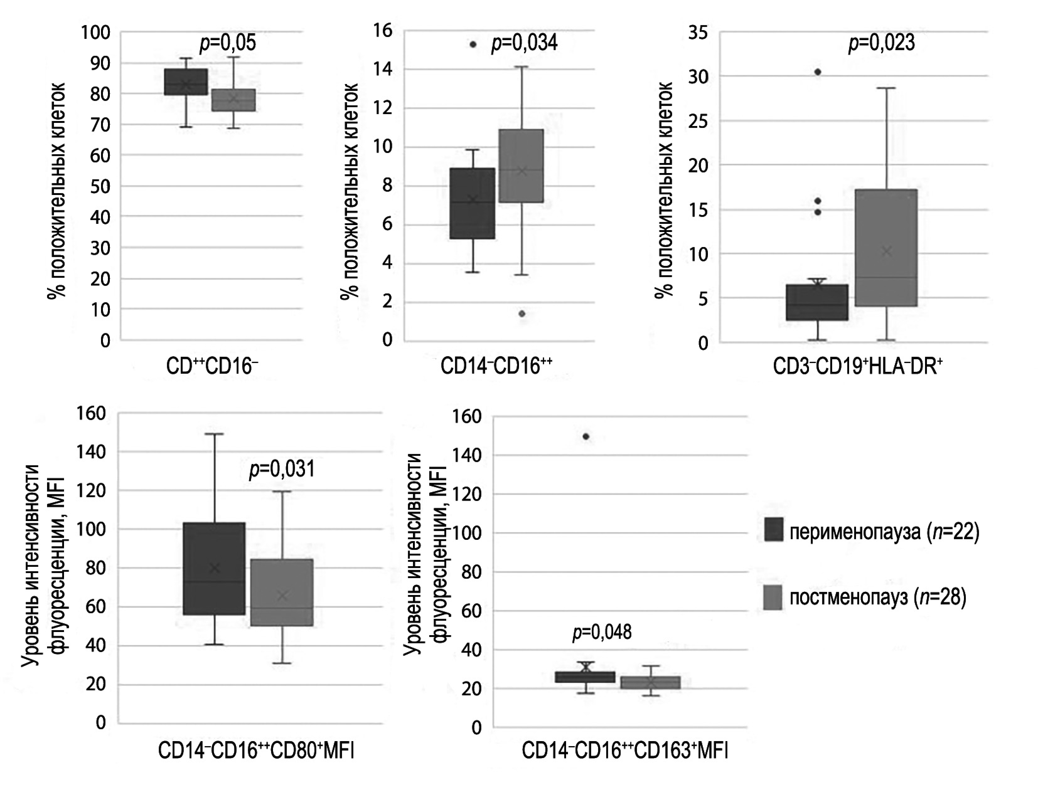 MATERIALS AND METHODS: The single-center, cross-sectional study included 50 women aged 45–59 years of reproductive stage, perimenopause, and early postmenopause. The main subpopulations of blood cells, namely, cytotoxic T lymphocytes (CD3+CD8+), T helper cells (CD3+CD4+), NK cells (CD56+CD16+), B lymphocytes (CD3–CD19+HLA–DR+), and classical (CD14++CD16–), nonclassical (CD14–CD16++), and intermediate (CD14+CD16++) monocytes and proinflammatory (CD86, CD80, CD40, and CX3CR1) and anti-inflammatory (CD163, CD206) markers on isolated monocyte populations were analyzed using flow cytometry (FACSCalibur; Becton Dickinson, USA). To detect blood plasma cytokines, a multiplex analysis method was used (Bio-Plex Human Cytokine Screening Panel; Bio-Rad Laboratories, USA).