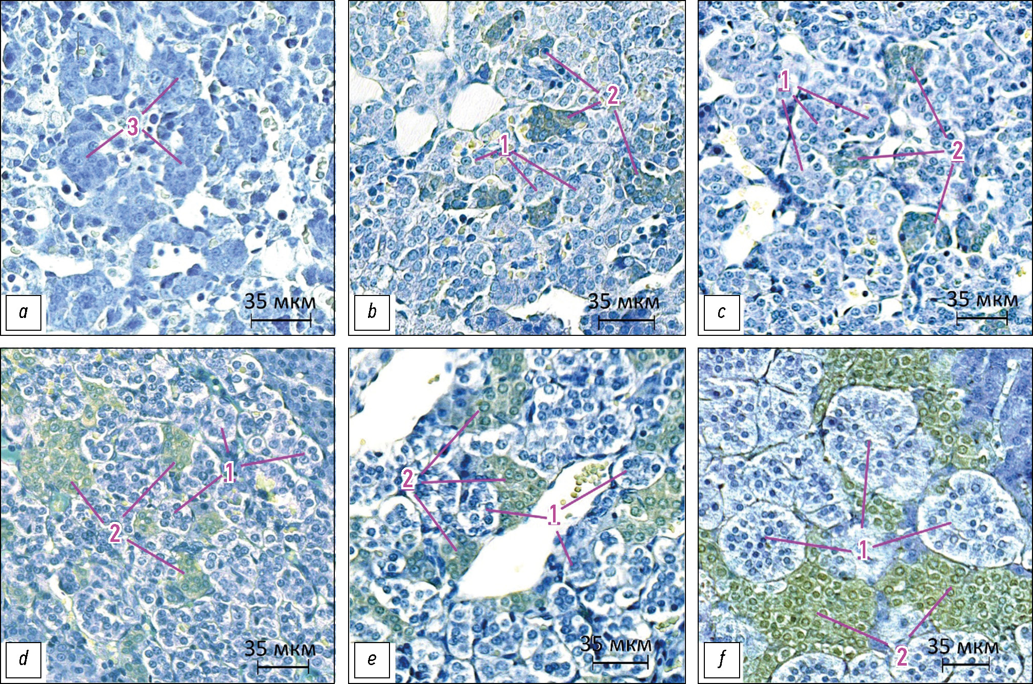 Fig. 1. Adrenal medulla of rats at different postnatal ages: a, newborn; b, 8 days; c, 14 days; d, 21 days; e, 1 month; f, 6–8 months. 1, A-modules; 2, NA-modules and arrays formed by their fusion; 3, rounded clusters of poorly differentiated chromaffin cells. Honore staining; a, b, c, d: objective ×20; e, f: objective ×40. © Eco-Vector, 2024.