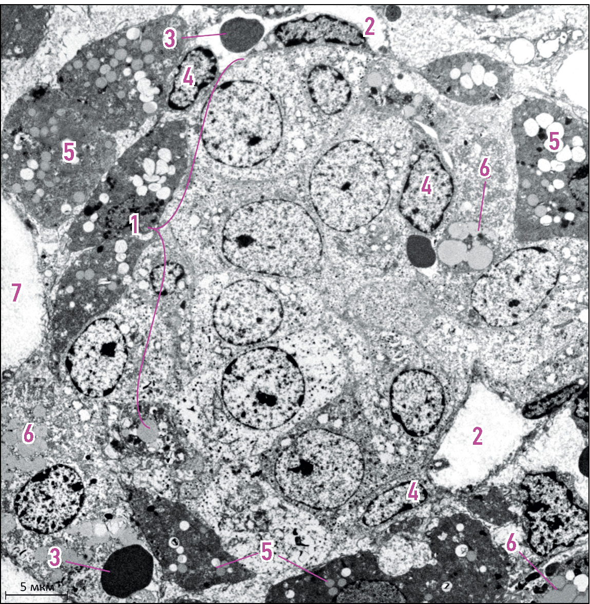 Fig. 3. Adrenal medulla of a newborn rat: 1, clusters of electron-lucent (light) chromaffinoblasts; 2, capillary; 3, erythrocytes; 4, fibroblasts; 5, cortical cells; 6, degenerating cortical cell; 7, venous sinus. Transmission electron microscopy. © Eco-Vector, 2024.