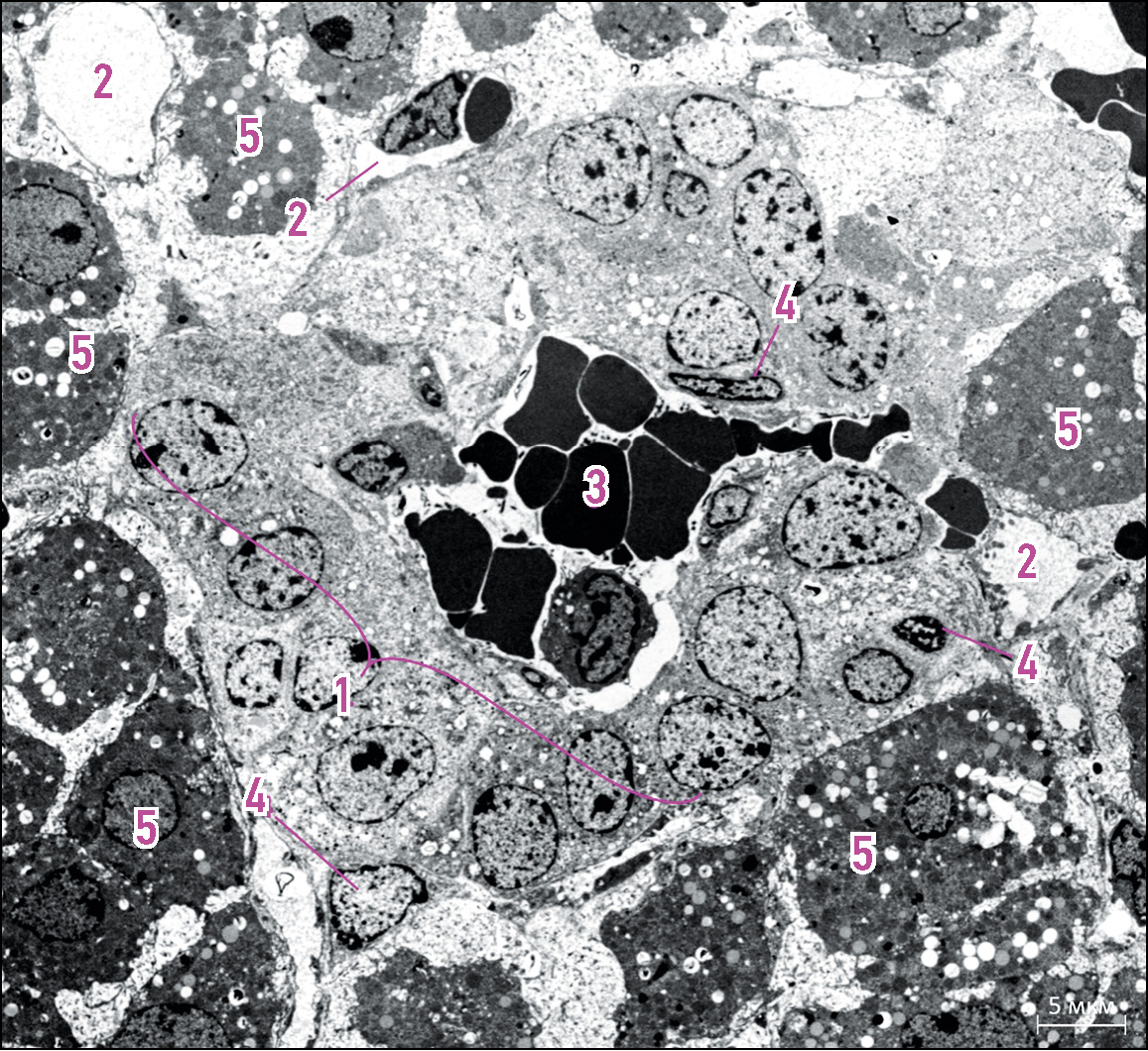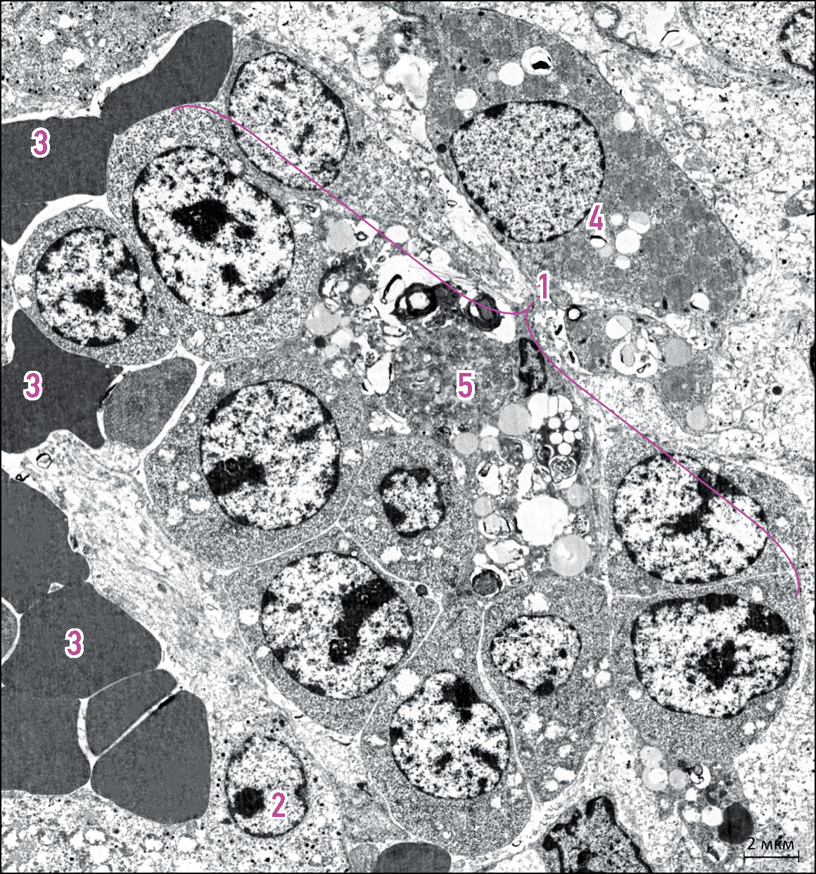 Fig. 4. Adrenal medulla of a newborn rat: 1, cluster of electron-lucent (light) chromaffinoblasts; 2, capillary; 3, hemorrhage within a medullary sphere; 4, fibroblasts; 5, cortical cells. Transmission electron microscopy. © Eco-Vector, 2024.