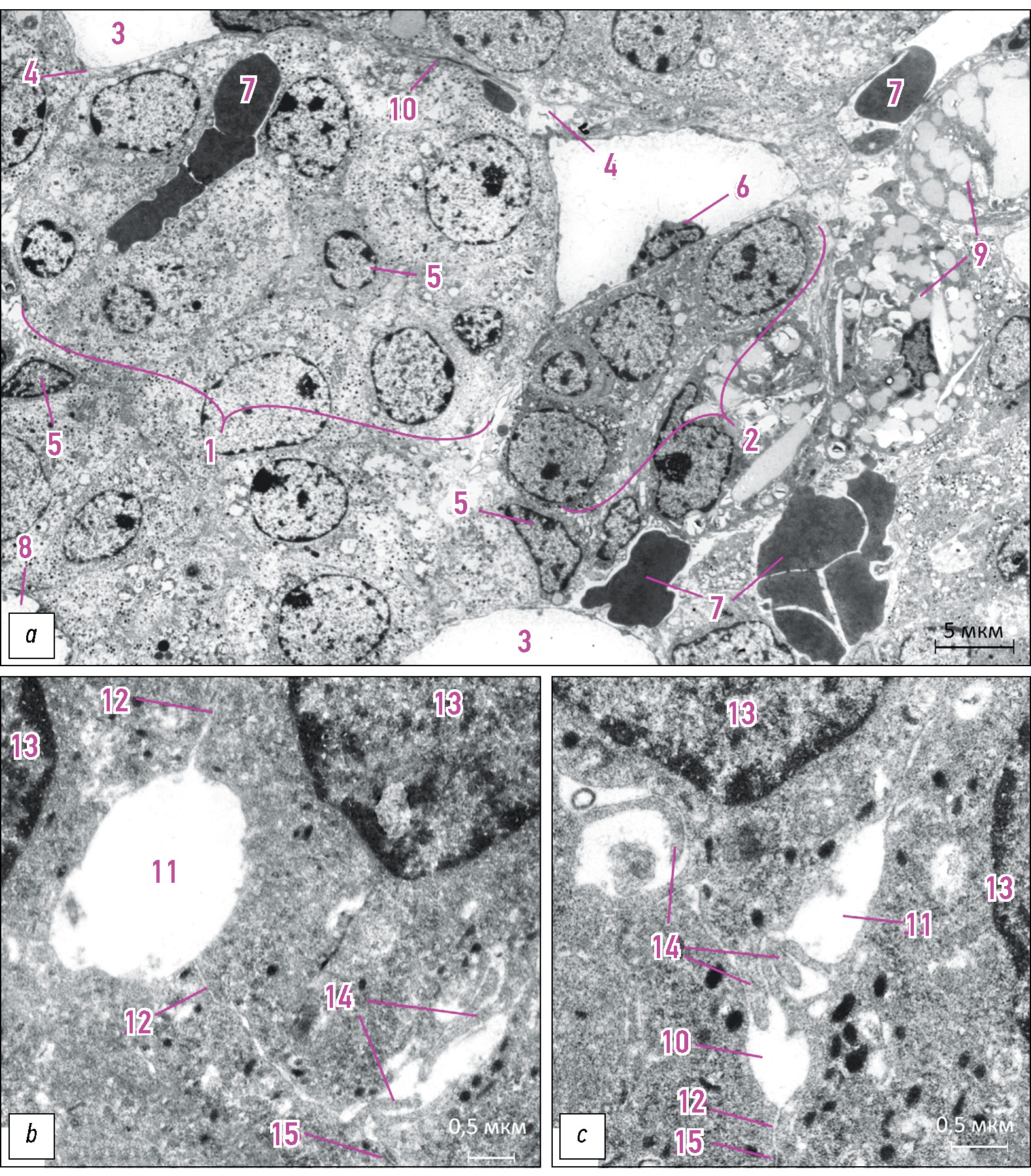 Fig. 6. Adrenal medulla of rats aged 6–8 days: a, A- and NA-modules; b, c, intercellular junctions between NA-cells. 1, A-module; 2, NA-module; 3, venous sinuses; 4, perivascular spaces; 5, fibroblasts; 6, endothelial cell; 7, erythrocytes; 8, capillaries; 9, degenerating cortical cells; 10, boundary between two A-cell clusters; 11, ampullary intercellular enlargements; 12, simple intercellular junctions; 13, nuclei; 14, microfolds; 15, desmosomes. Transmission electron microscopy. © Eco-Vector, 2024.