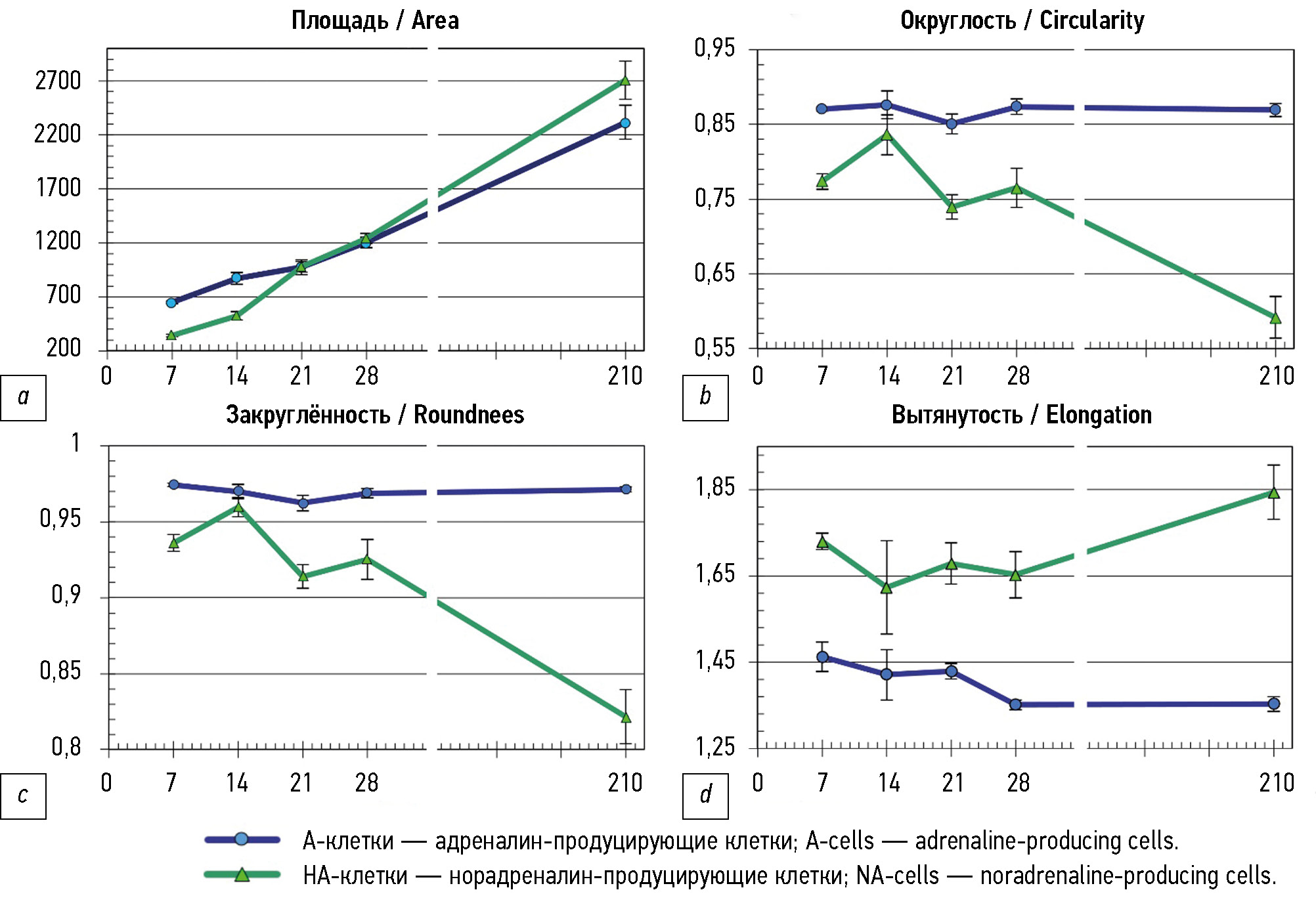 На полученных с помощью микроскопа OPTIKA DM-20 (Италия) цифровых фотографиях случайно выбранных гистологических срезов (от 5 до 15 срезов на одно животное в зависимости от размера образца) в программе ImageJ (версия 1.54f, National Institutes of Health) проводили морфометрический анализ — по 40 измерений для каждого из случаев в выборке. Для всех возрастов отдельно анализировали А- и НА-клетки, за исключением новорождённых, у которых дифференцировка хромаффиноцитов на А- и НА-клетки ещё не завершена.