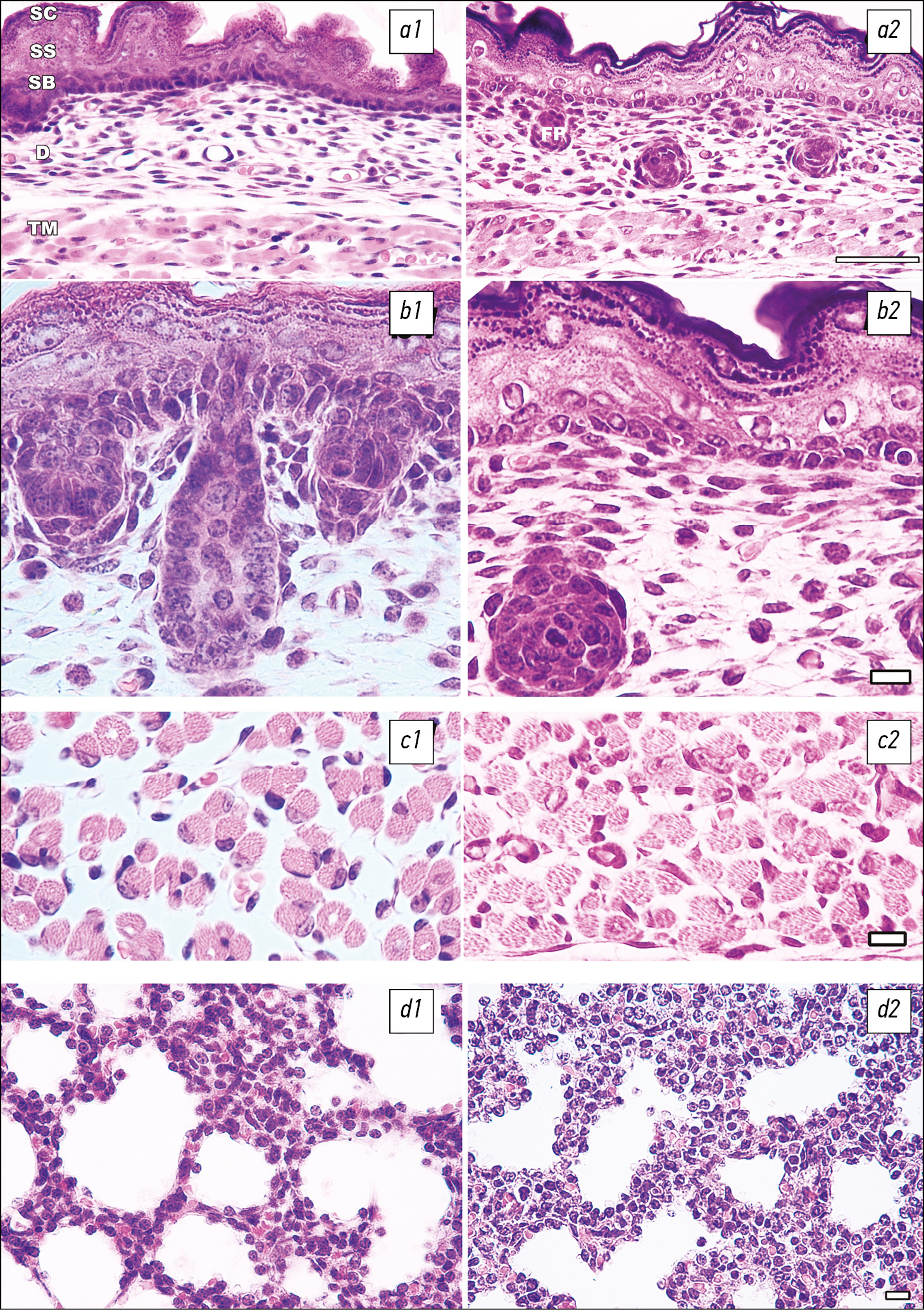 Fig. 1. Sections of murine embryos (day 19 of intrauterine development): Left column specimen transfer through polyethylene glycol; Right column specimen transfer through paraffin wax; a1,2,b1,b2, epidermis and dermis. SC, stratum corneum; SS, stratum spinosum; SB, stratum basale; D, dermis; FP, folliculus pili, hair follicle; TM, textus muscularis, muscle tissue. c1, c2, muscle tissue, musculus erector spinae; d1, d2, lung tissue. Scale: a, b, 100 µm; c–d, 20 µm. All microphotographs were taken with the same microscope and camera settings.
